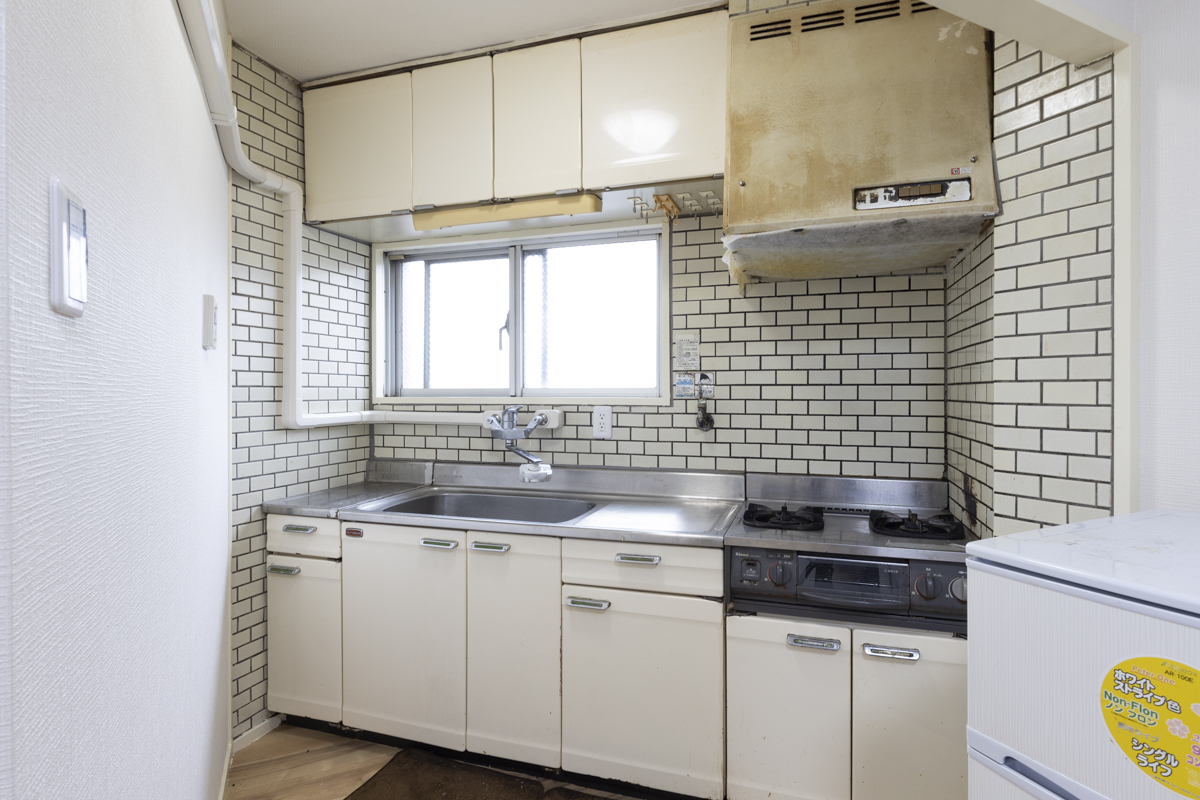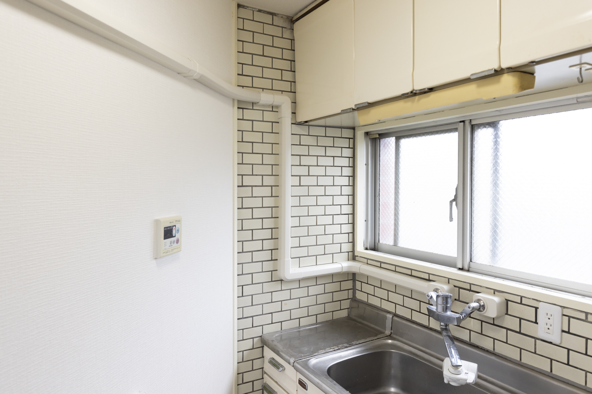 リビングから少し出っ張ったところに設置されている、サブウェイタイルのデザインが目を引くキッチン。古さが気になるレンジフードなどはもちろん交換可能