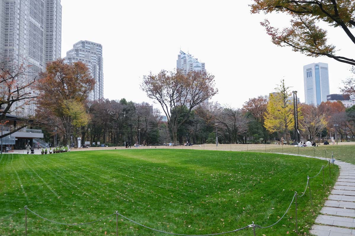新宿中央公園の芝生広場。公園内にはスターバックスコーヒーやカフェレストランもあります。