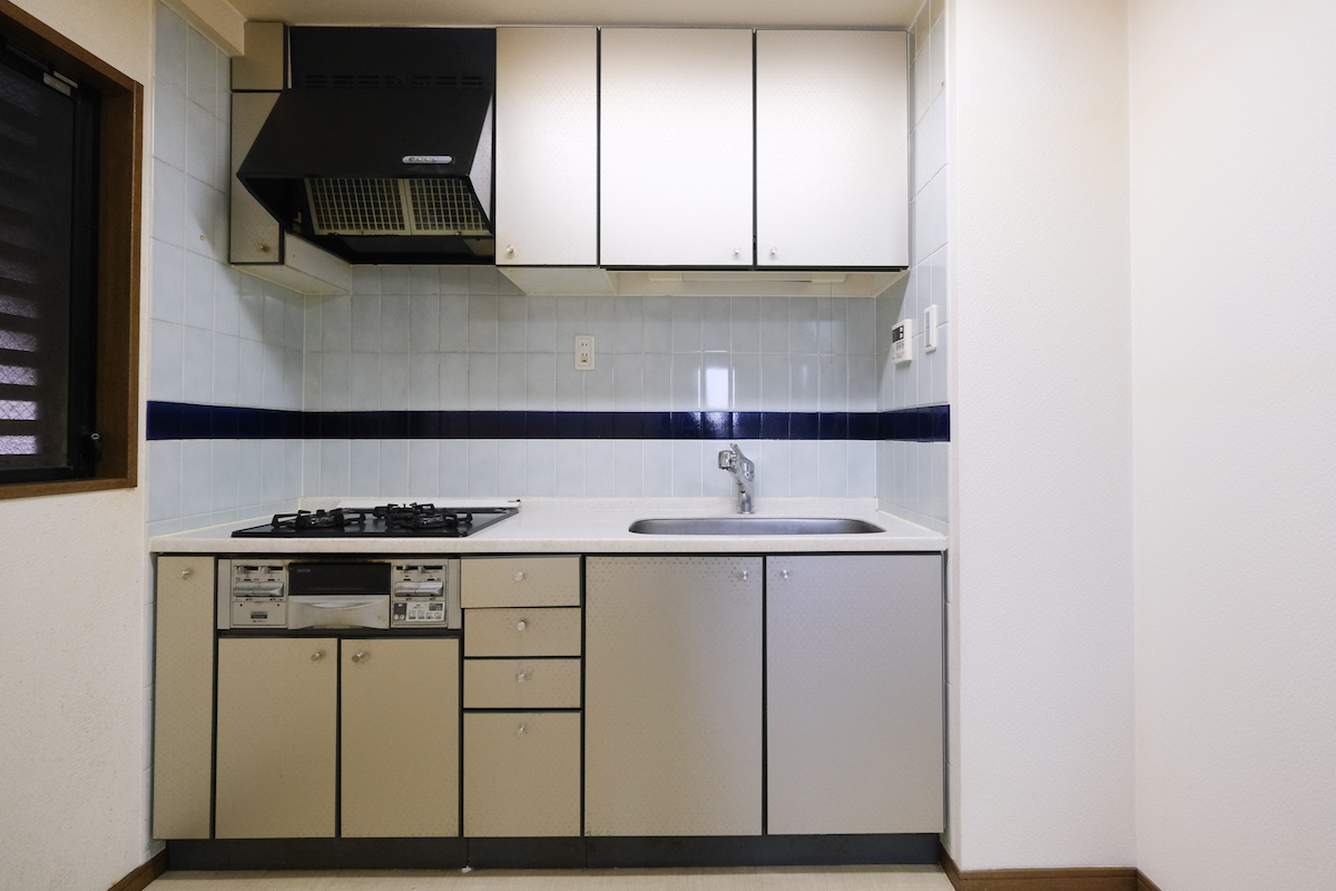 壁付けのキッチン。建物の吹き抜け部分と接しているため、キッチン、浴室に窓があり、換気がしやすい