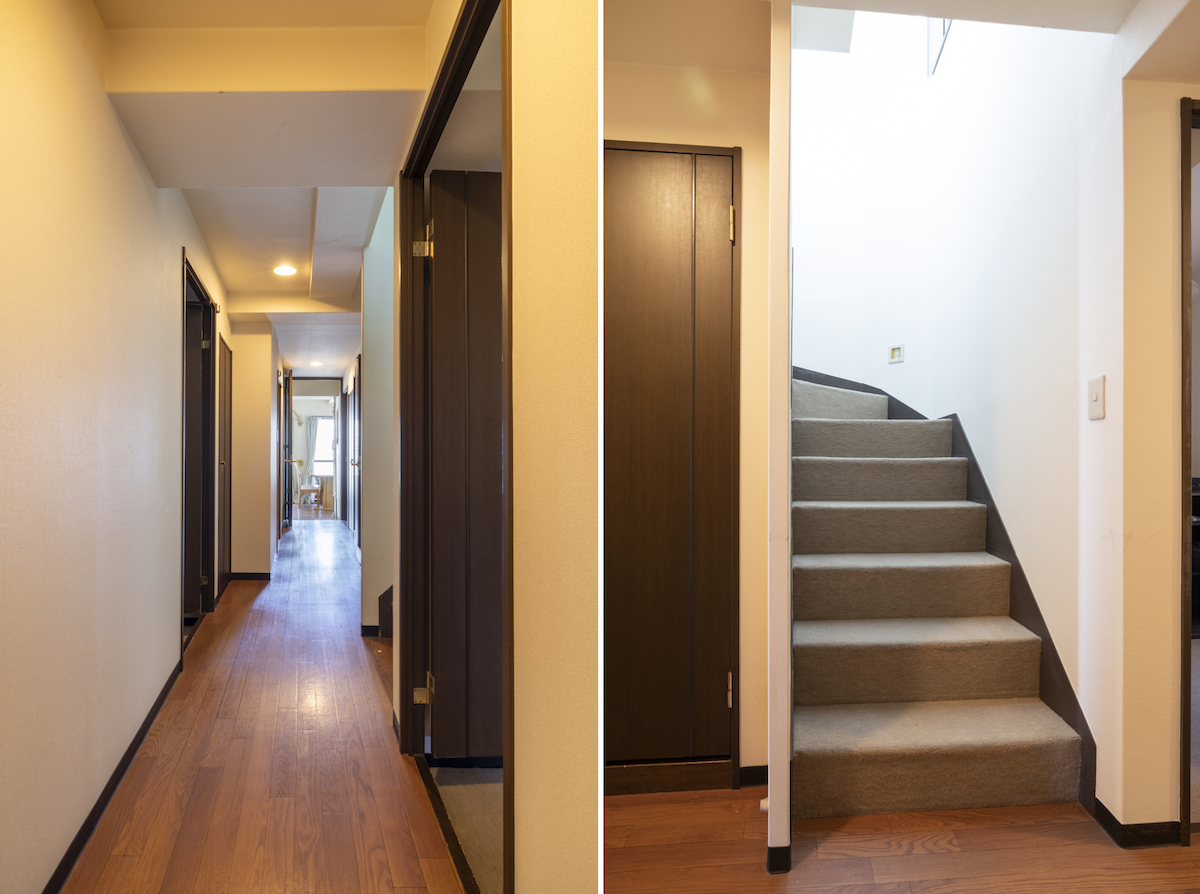 左:入り口からリビングダイニングまで伸びる廊下。部屋数の多さとLDの明るさが見て取れる