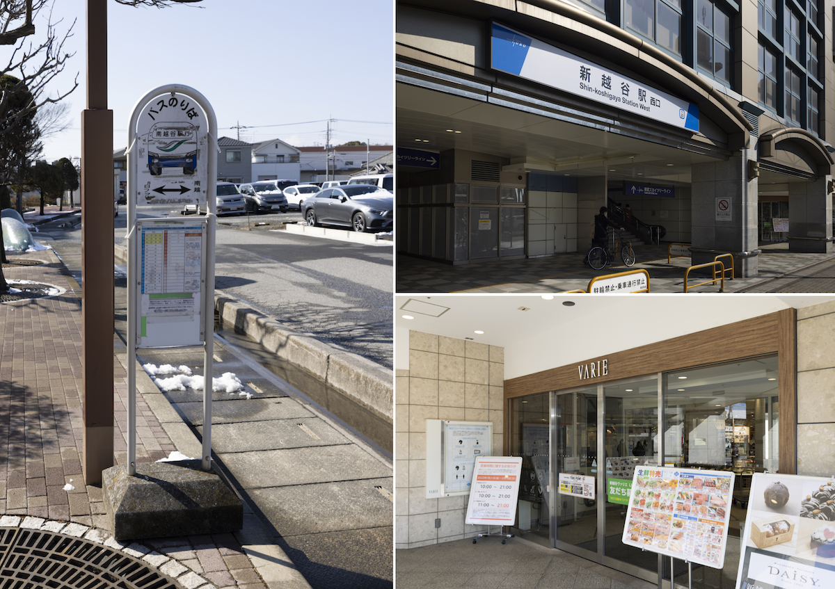 右上:シャトルバスで利用する新越谷駅。JR武蔵野線を利用できる南越谷駅が隣接