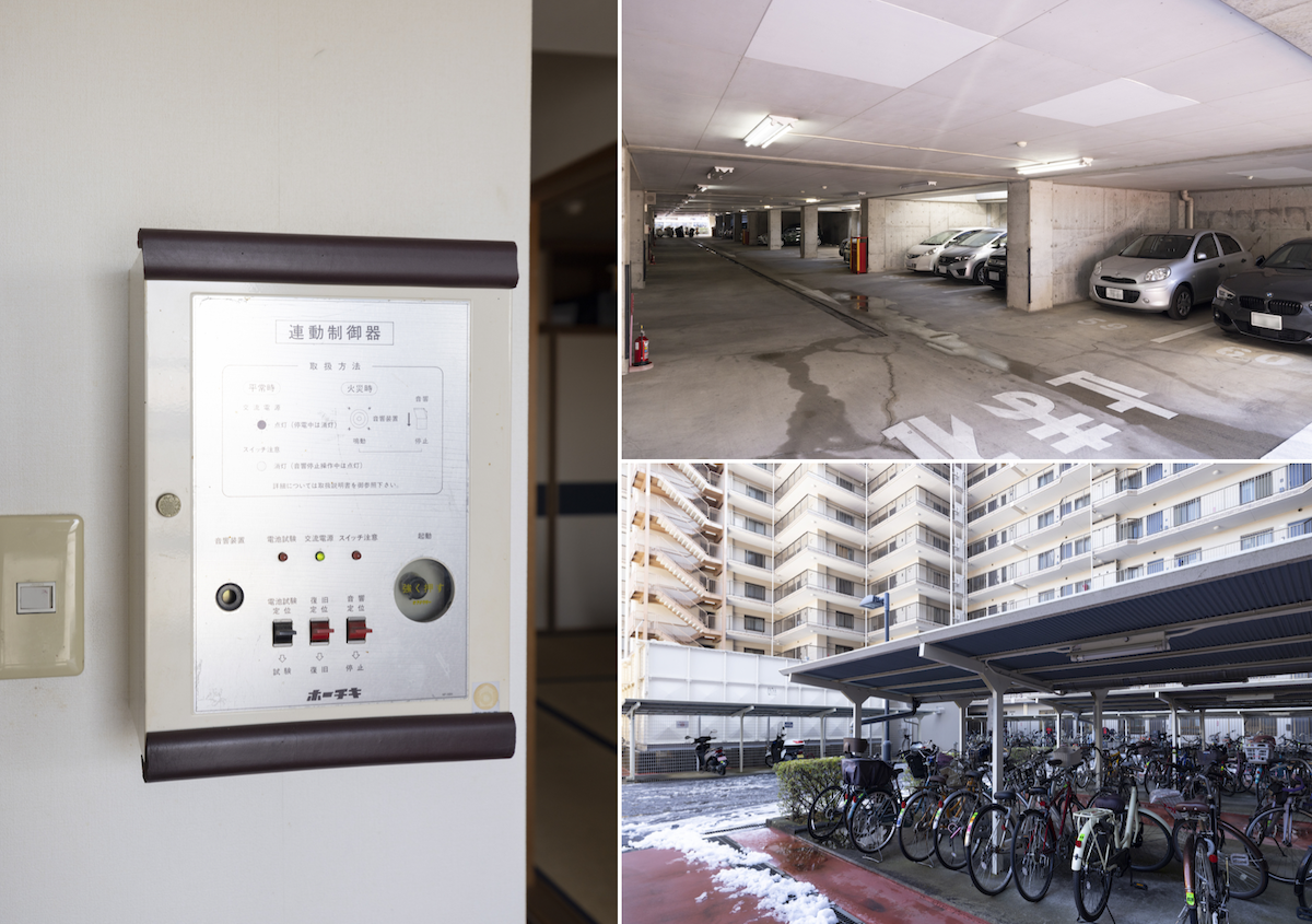 右下:屋根付きの駐輪場。一部バイク置き場にもなっている