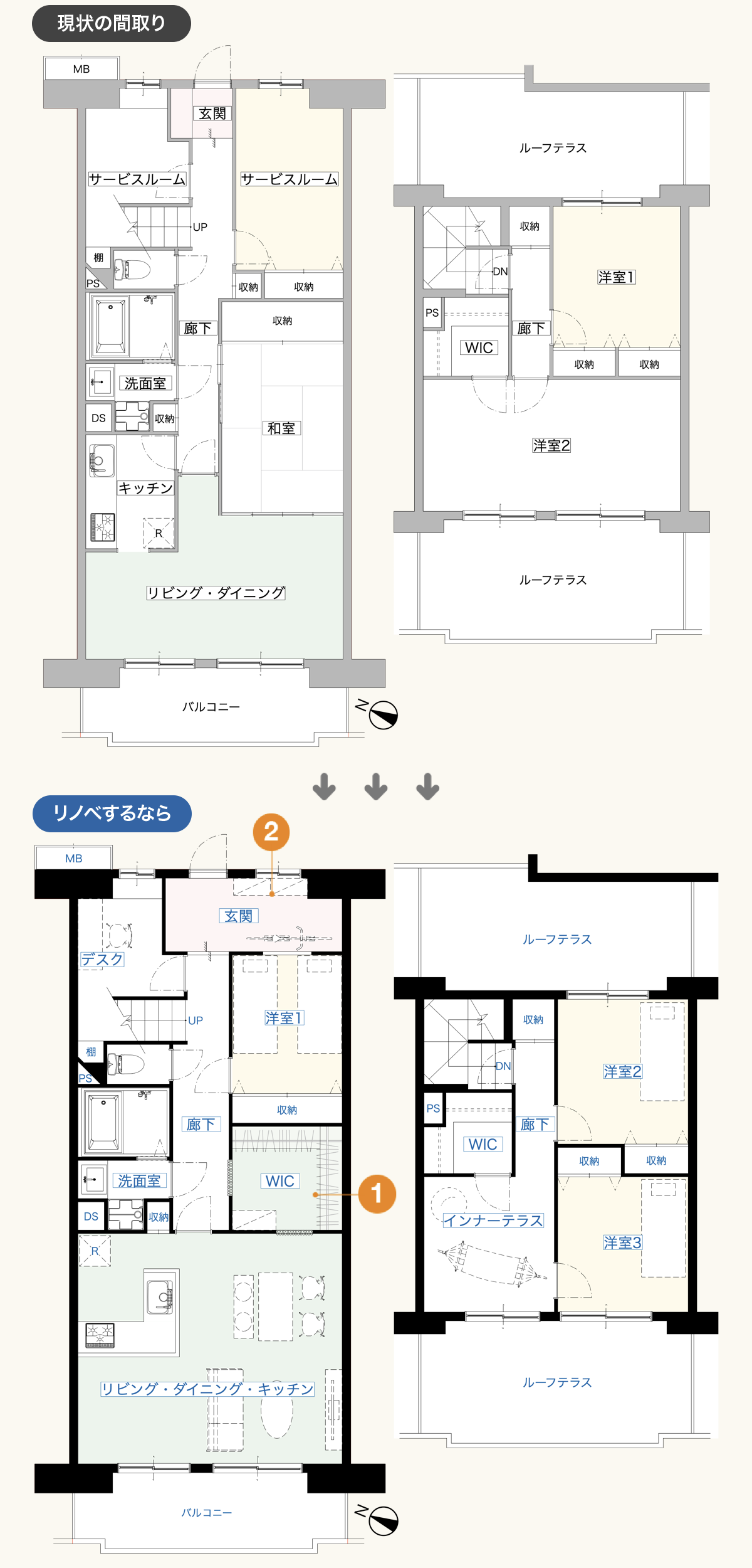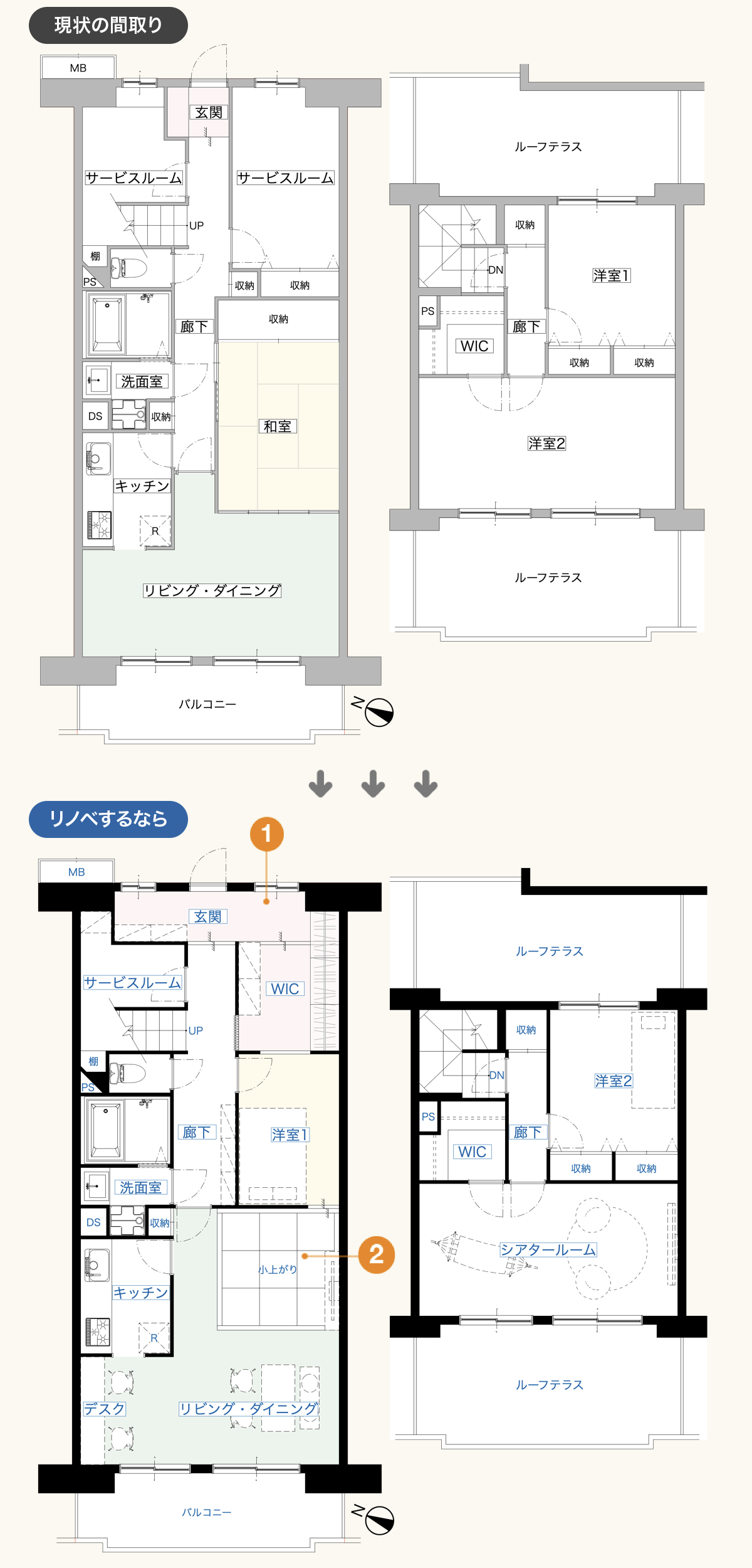 戸建て感が味わえるメゾネットの本物件も、部分的なリノベーションで、さらに機能的でオシャレな部屋に。プロ目線で作成したリノベーションプランを2つご紹介します。