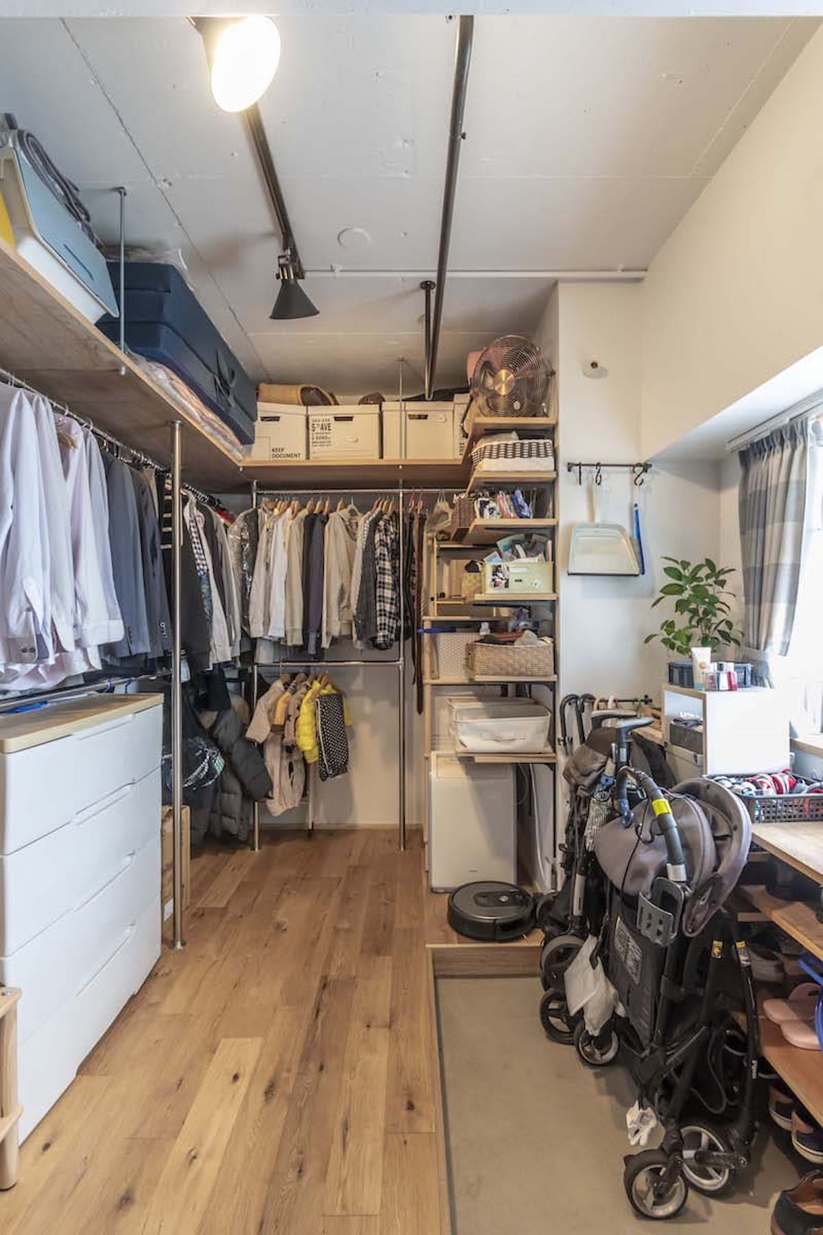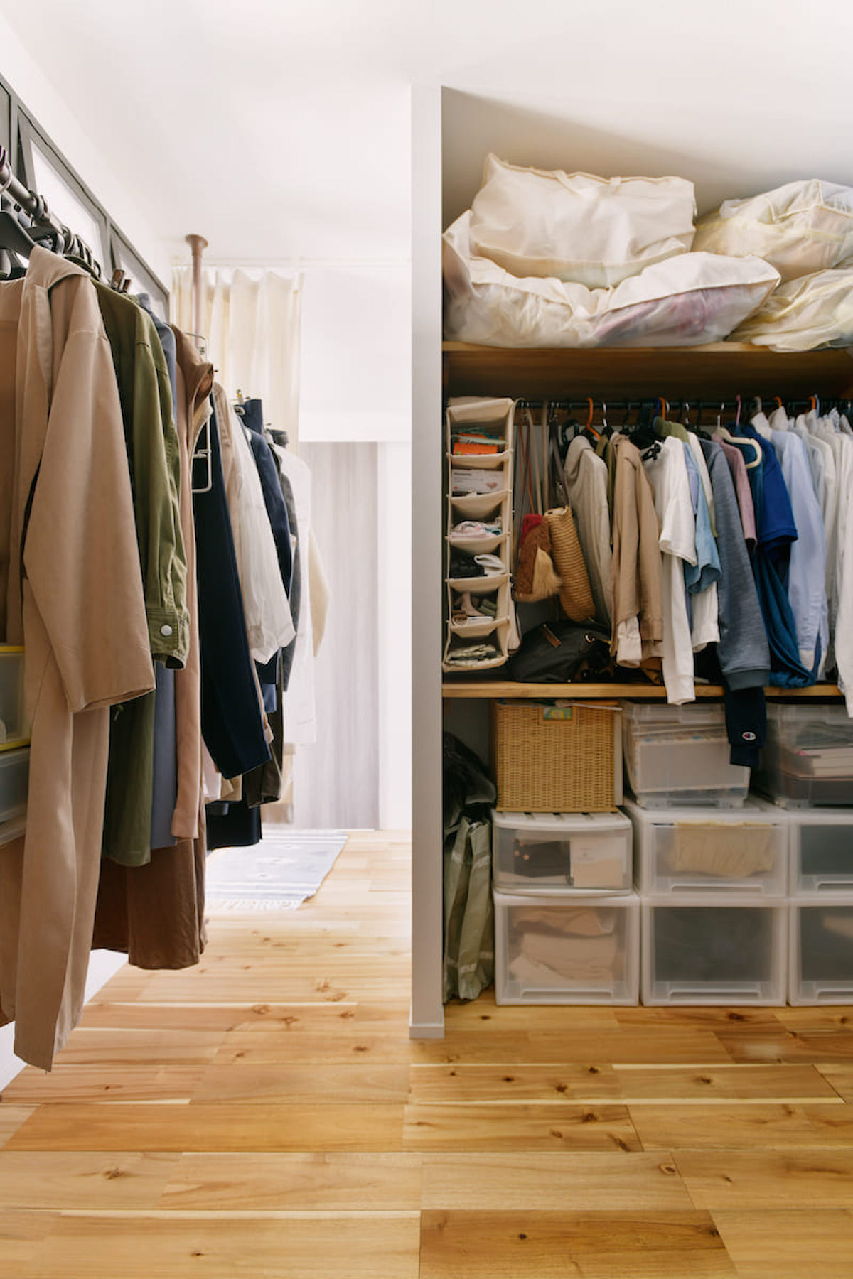 土間玄関とWICが繋がっていることで、収納スペースとしてある程度の広さも確保できるほか、衣料品だけでなく、家族共用のアウトドア用品も一緒に管理できるメリットもあります。