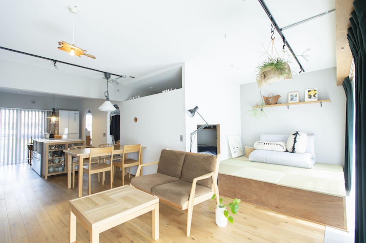 リビングダイニングに小上がりを設ければ、下は収納に、上は畳を敷いてくつろげる空間をつくることができます。