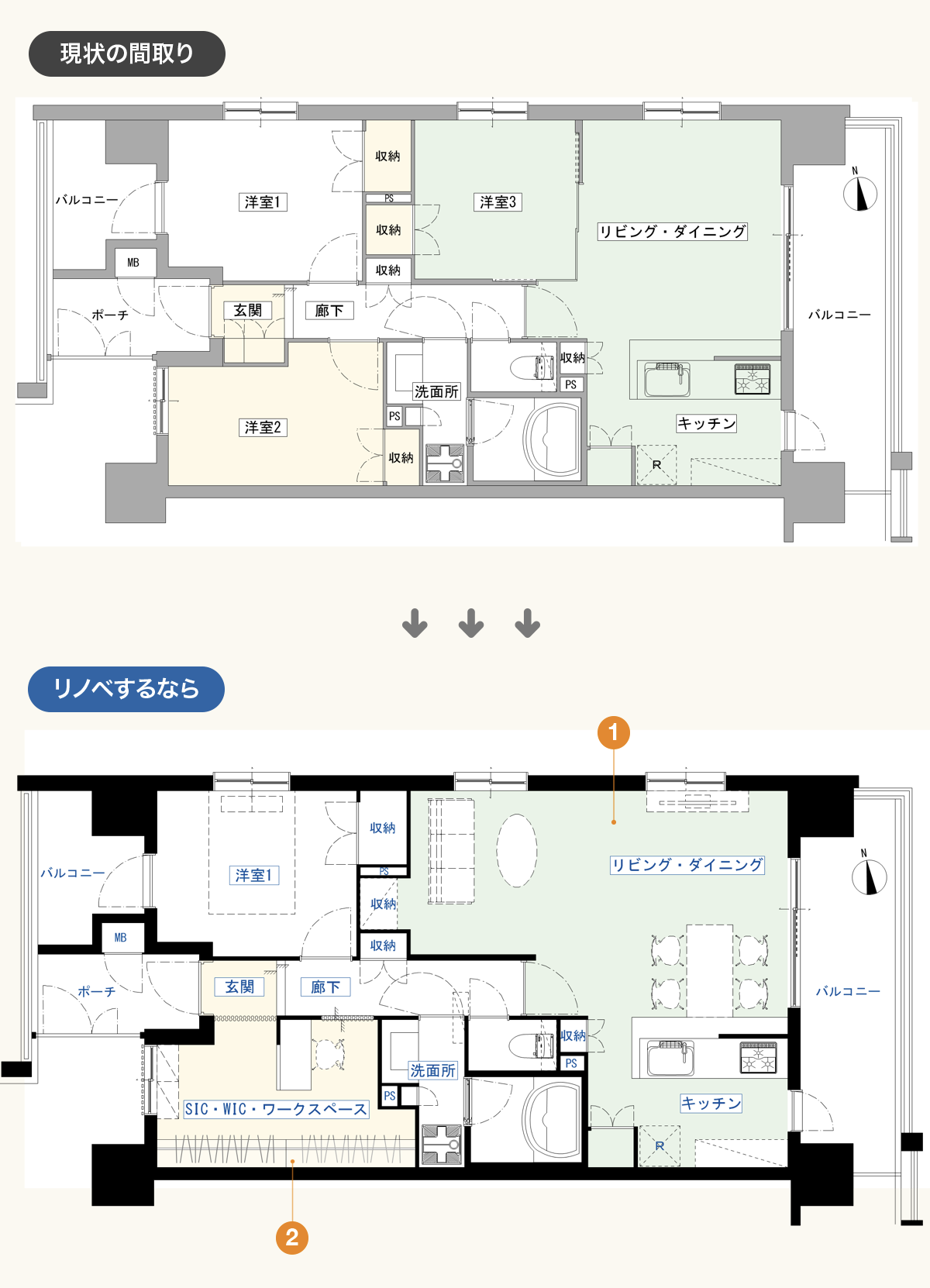 居住エリアと収納エリアを明確にした間取りに変更して、リビングダイニング生活空間を広げてみるのはいかがでしょうか?合わせて、玄関と連動させたリノベーションならではの空間づくりも提案します。