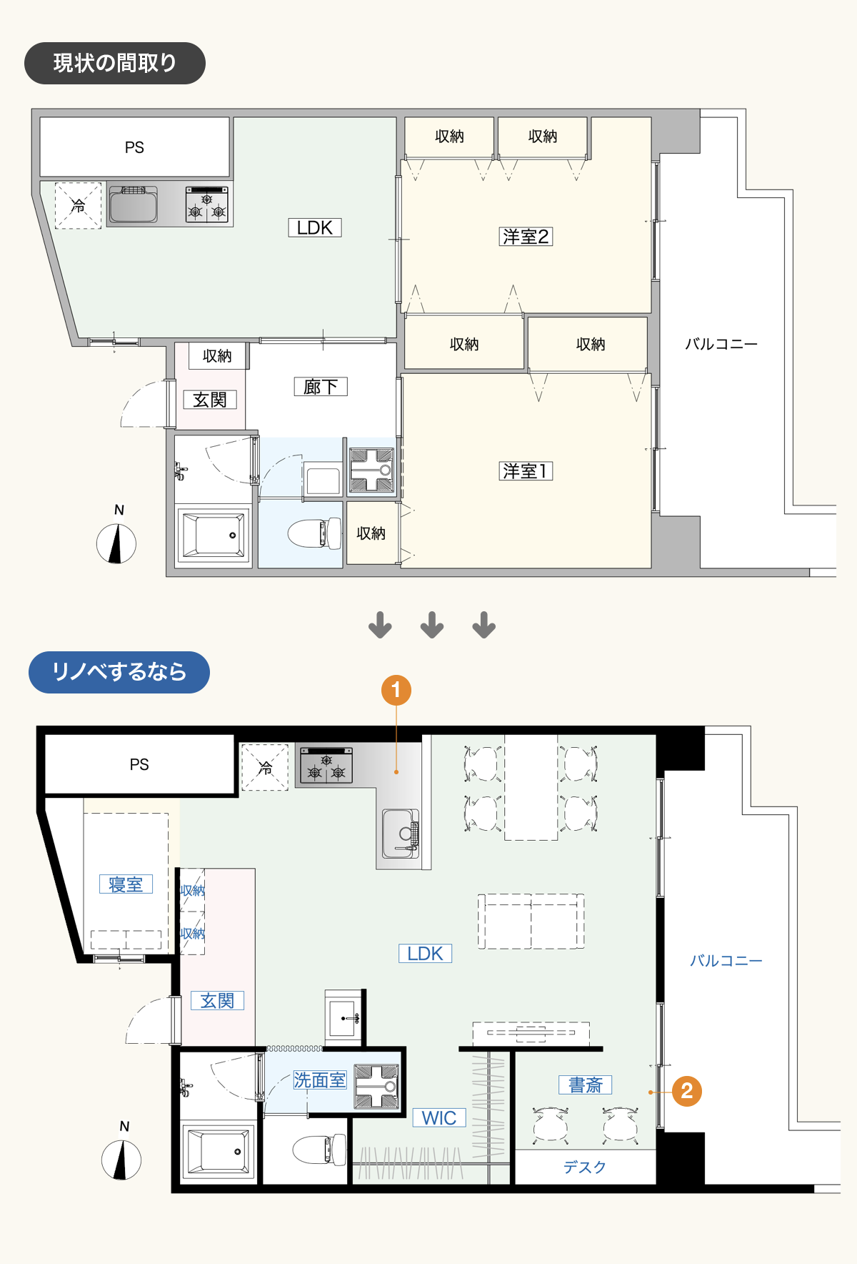 広さの同じ個室が2つ設けられ、このままでも住みやすい間取りとなっていますが、住む人数と用途に合わせたリノベーションを行うことで、より快適なお部屋環境を追求することができます。今回はプランを2つご紹介します。