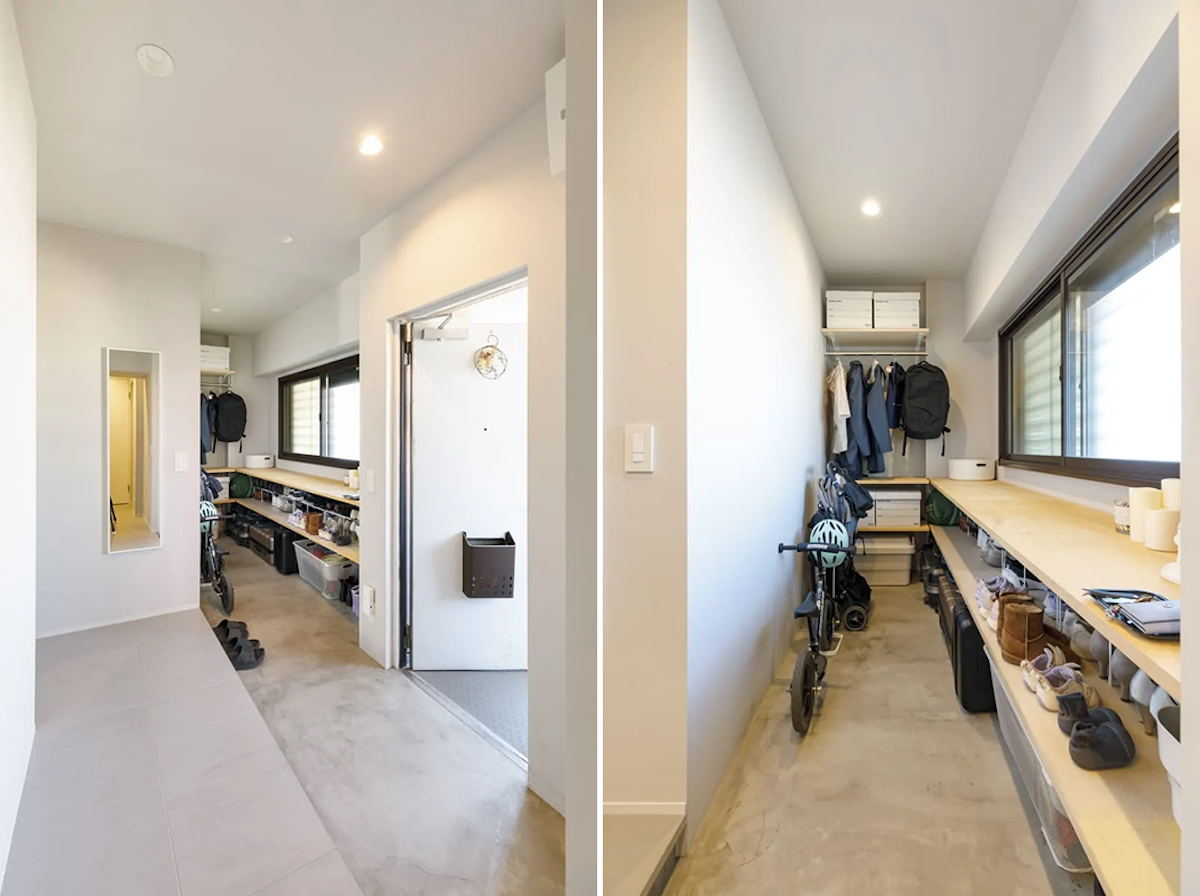 広い土間は靴やベビーカーをラクラク収納できるのはもちろん、玄関の間口を広くすることで家族が同時に出入りできて快適です。