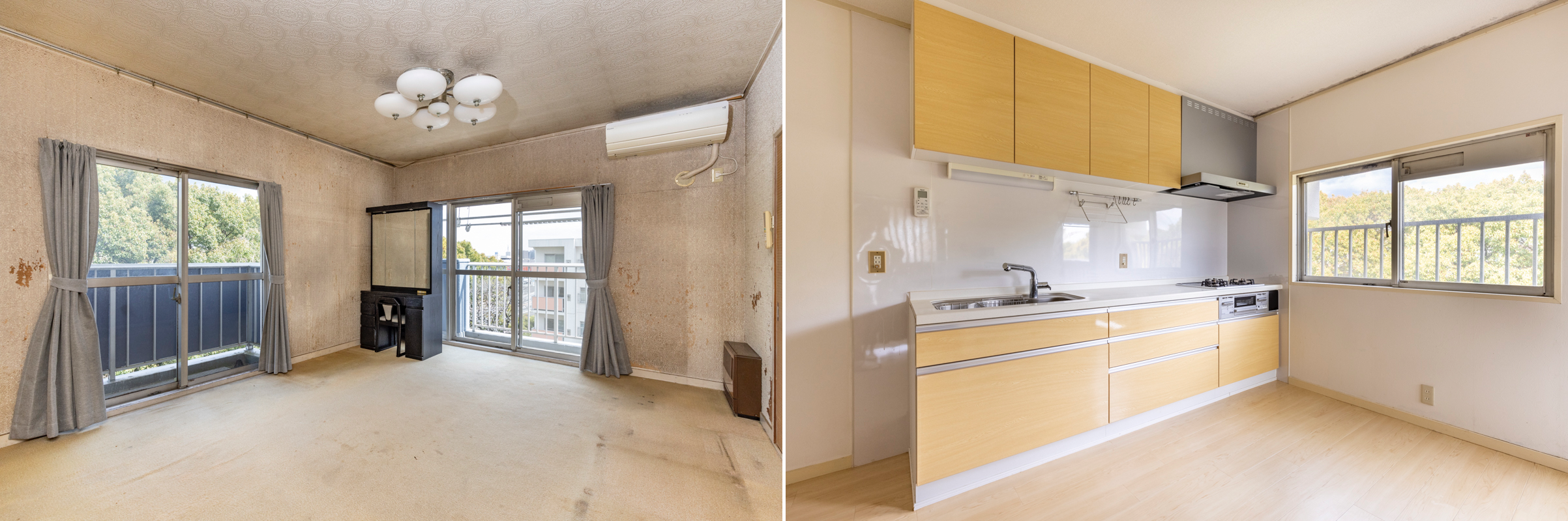 この部屋でリビングが一番過ごしやすい場所ですね。日中は明かりが必要ないくらい明るく風通しも良いです。家族5人暮らしの時でも狭さを感じたことはありませんでした。キッチンは日々の食事作りだけでなくお弁当作りなどもあってよく使っていたので、定期的にリフォームしていました。