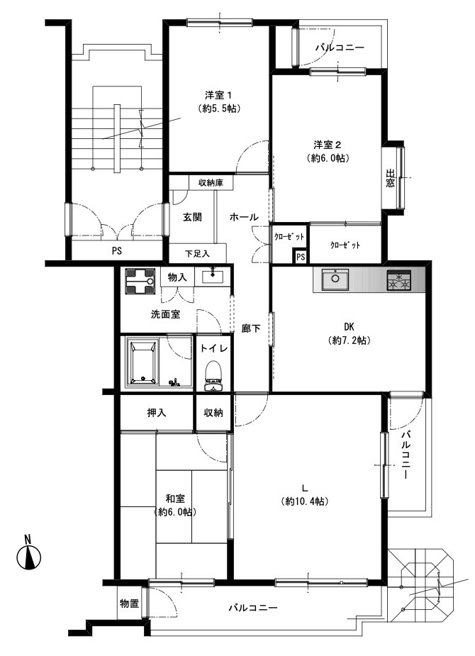 部屋一つ一つが広めで余裕のある間取り。団地ならではの特徴で棟ごとの間隔が広く、採光がしっかりしていてて明るい空間が広がっています。