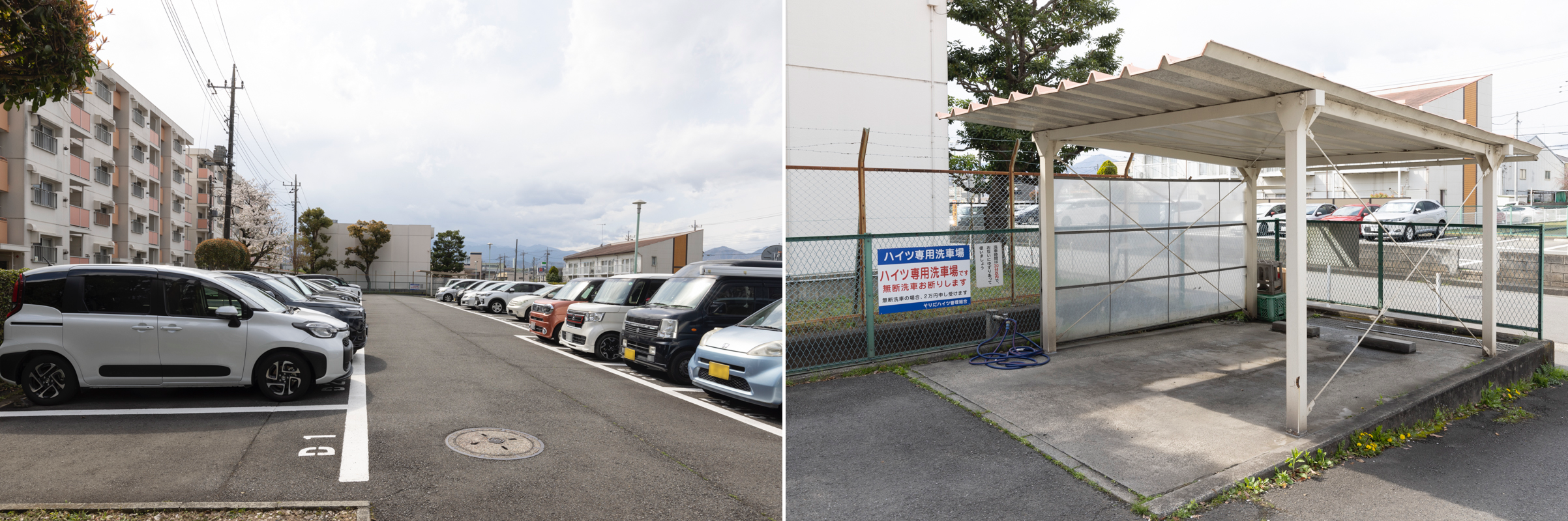 駐車場は平置きタイプ。敷地内に洗車場も設置