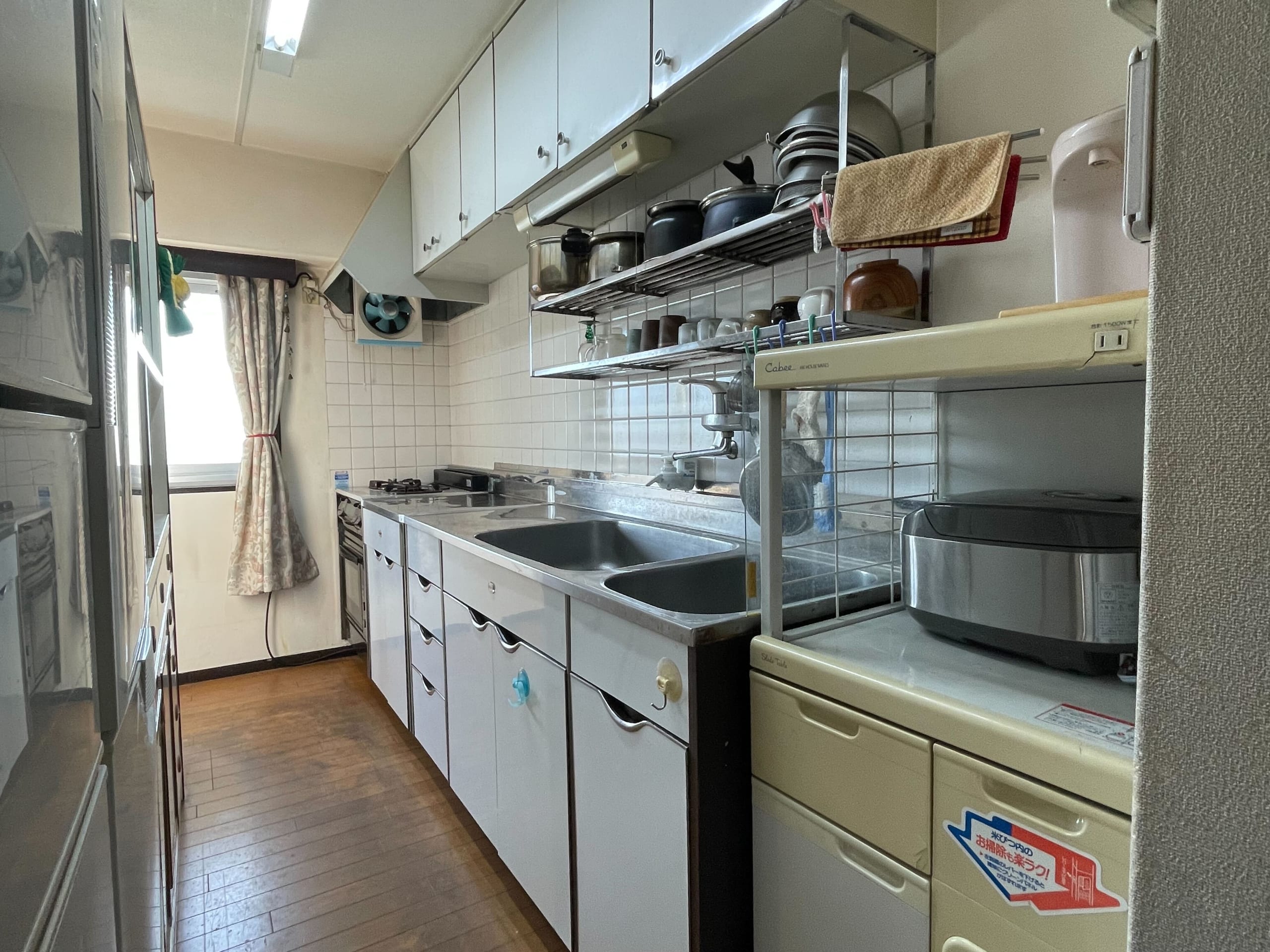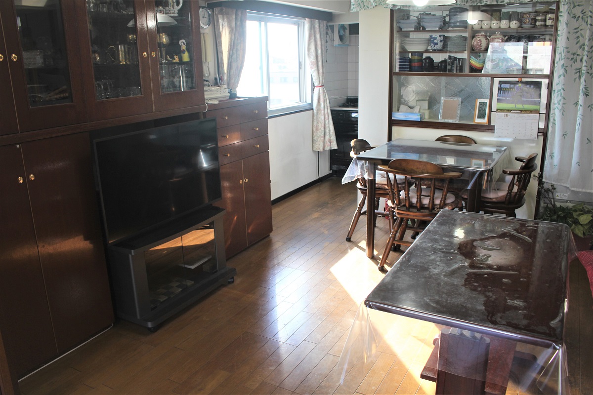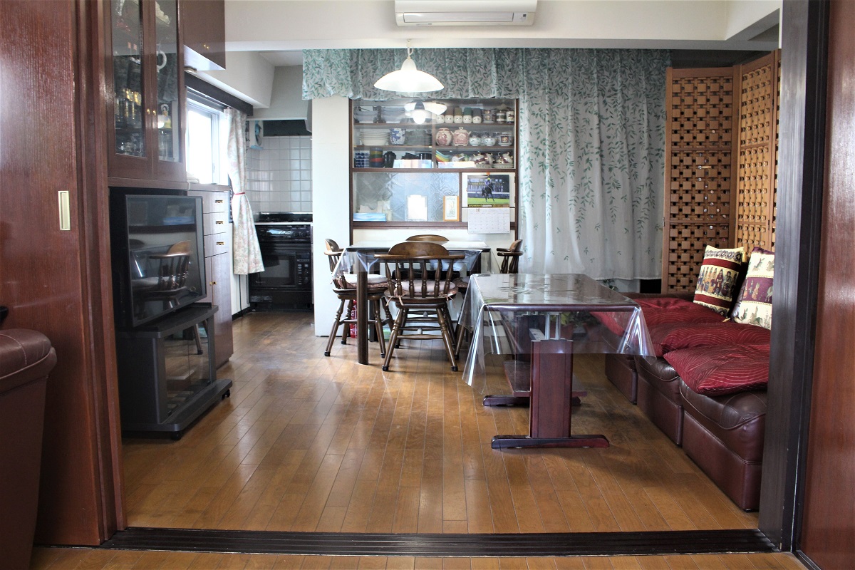 ダイニング・キッチンには仕切りはないが、売主さんはキッチンとダイニングの間に食器棚を置き区切っている
