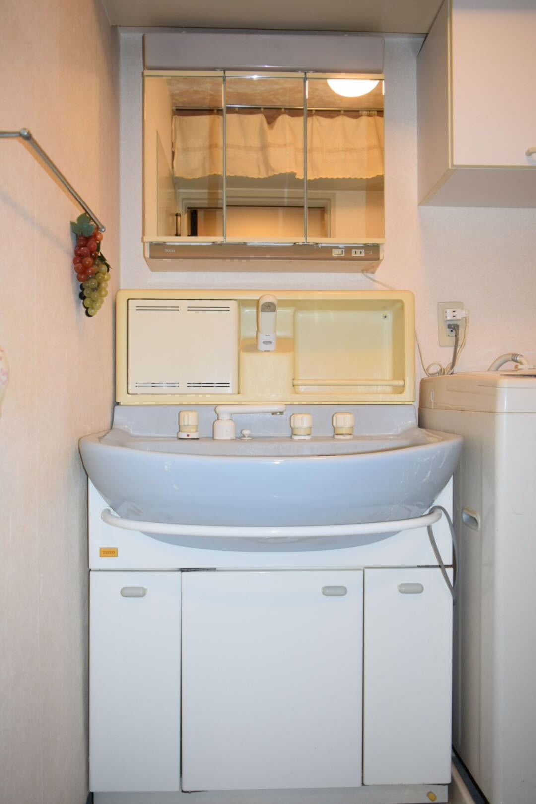 独立洗面所の収納力も十分。シャワーヘッド完備