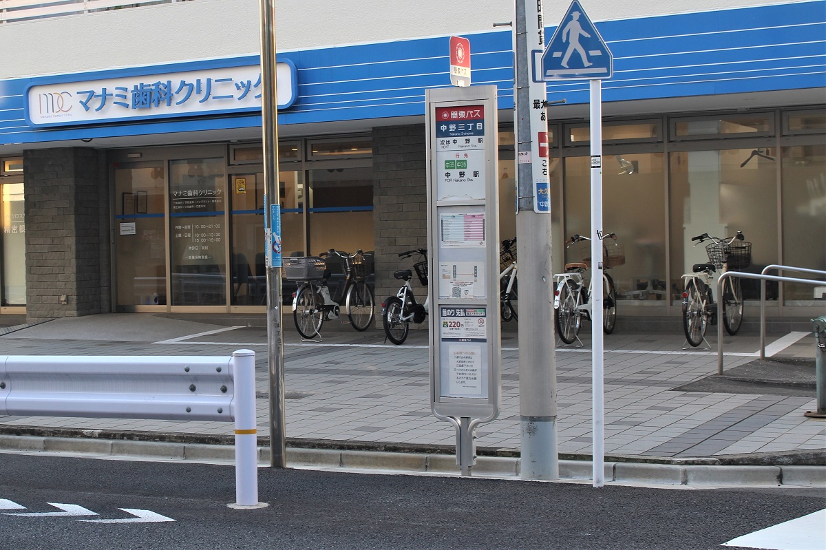 マンションのすぐ前にあるバス停。その奥にはマンション1階にある歯医者もある