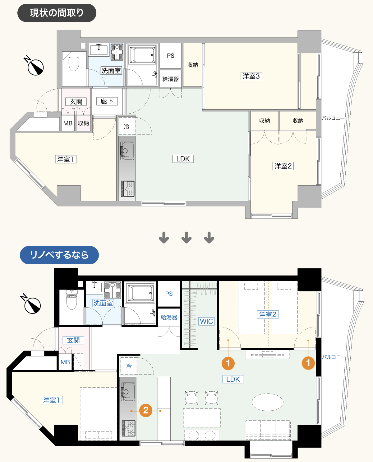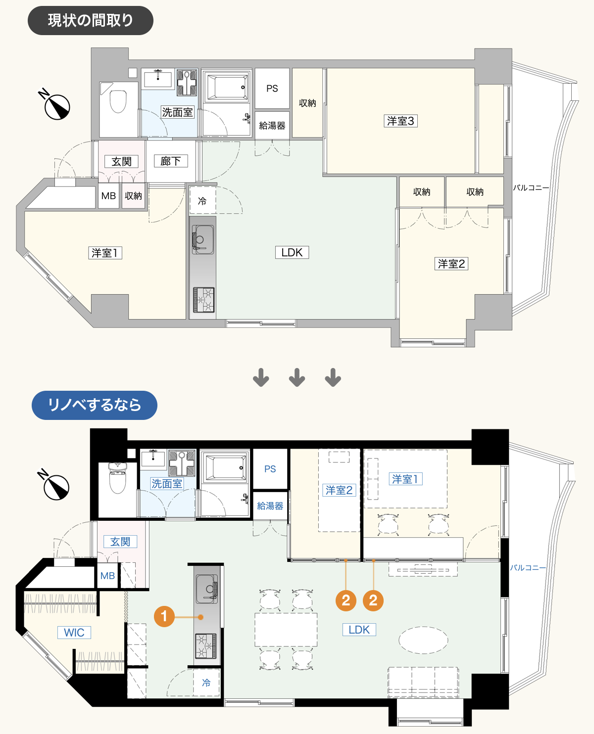 間取りや設備からは制約になりそうなところがないため、リノベーションがしやすい室内です。現状のままでも十分に住むことができますが、廊下や細切れの部屋を解体してLDKを広げるリノベーションを行うことで、さらに利便性が高まる物件になっています。今回はファミリー向けに2つのプランを提案してみました。