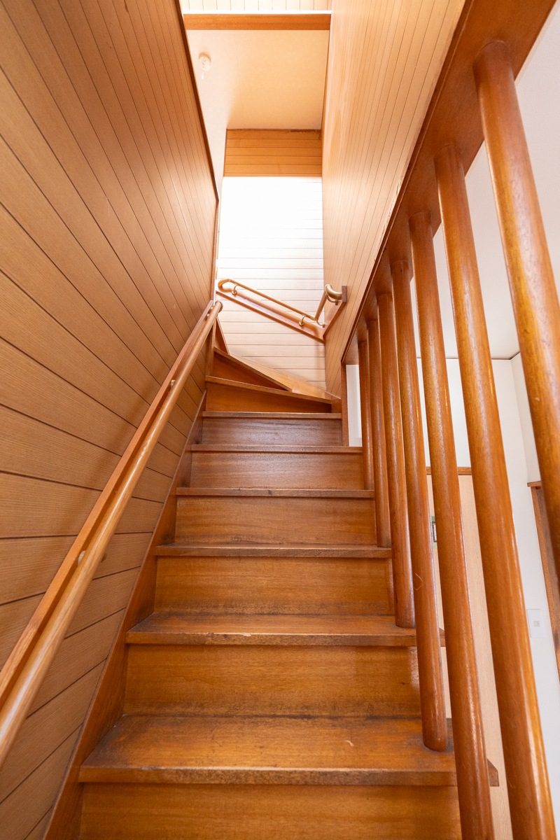 2階への階段はスケルトン状になっていて明るい。2階の廊下は吹き抜けで、開放感がある