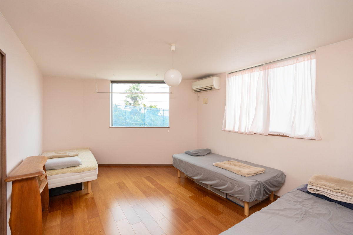 キングサイズのベッドを置いてもまだまだスペースに余裕があります。壁の色も、心が落ち着くような優しい色合いになっています。朝、窓から差し込む光で気持ちよく目覚められる、私たちにとってもお気に入りの空間です。