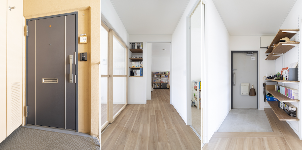 玄関はキーロックが2つついた新しめなもの。玄関内には備え付けの棚があり、靴だけでなく、小物やインテリアで飾り付けることもできる。リビングとの境の扉にガラス窓の引き戸を採用することで、自然光が玄関まで入り込んでとても明るい