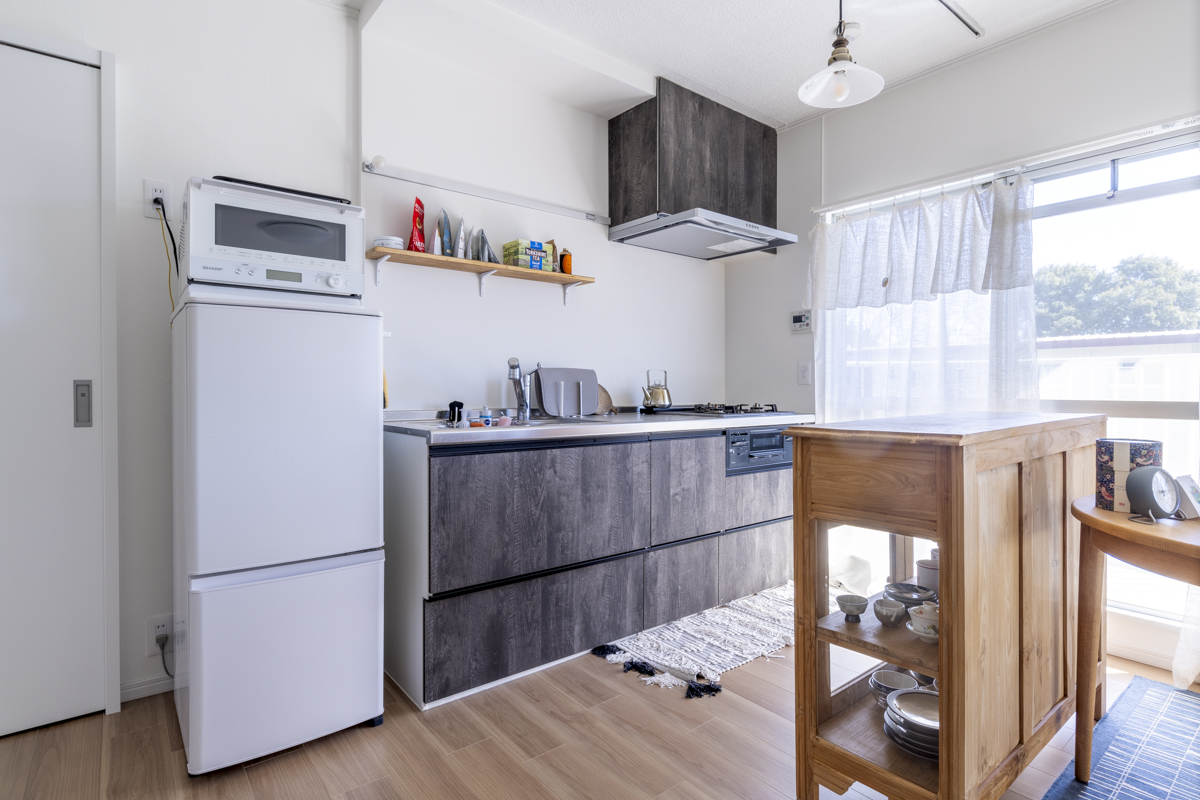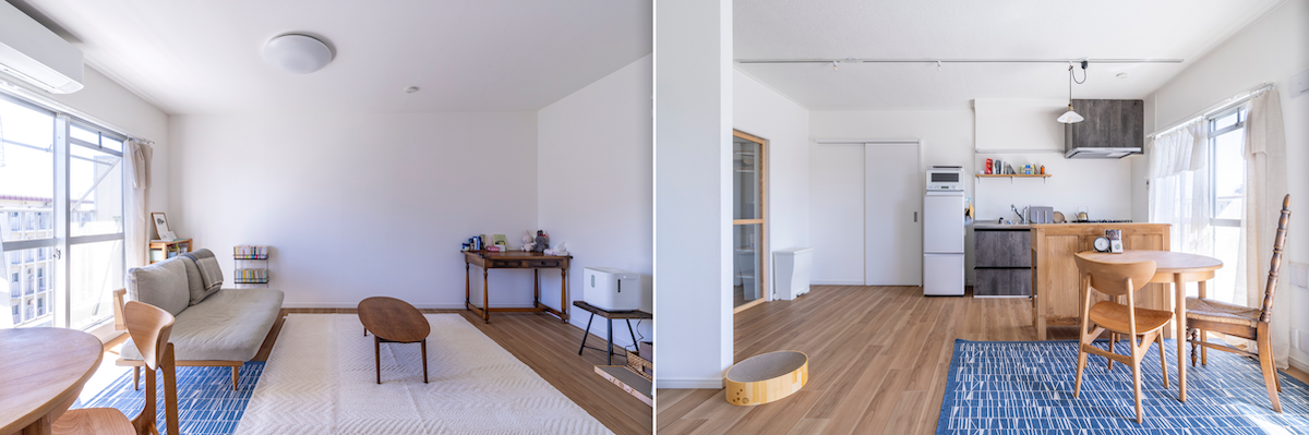 キッチンに作業台兼食器棚や食卓テーブル、2人がけのソファーを置いてもかなり余裕のあるLD。白壁のシンプルな内装で、お気に入りの家具もよく映える