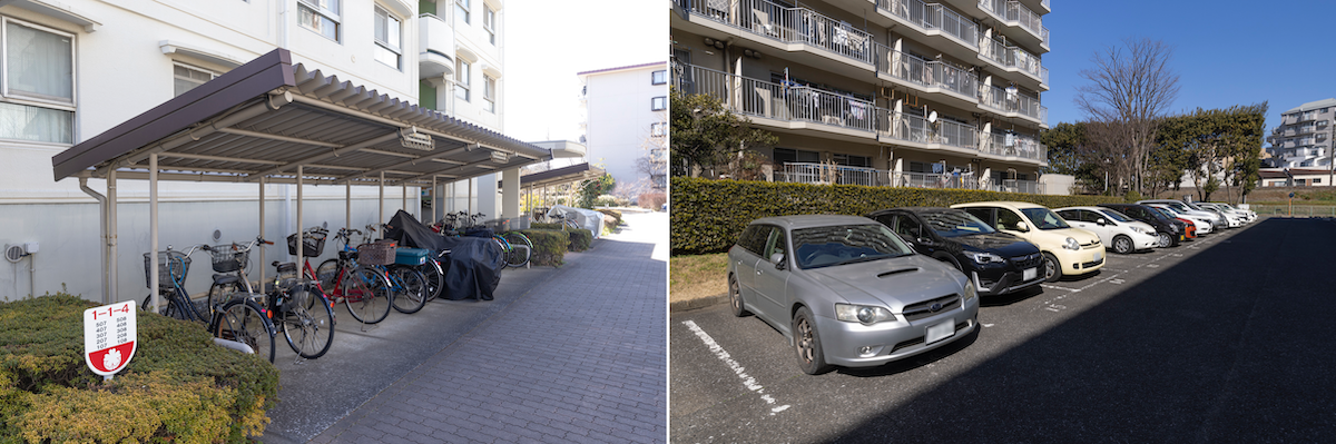 駐輪場は棟ごとに用意。駐車場は平置きタイプ。空きもあるので車の所有もしやすい