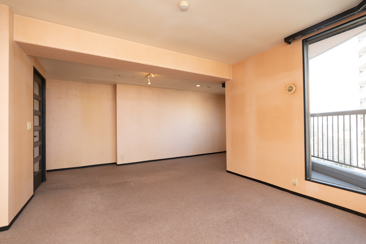廊下からリビングへ進むにつれて、外の景色が視界に広がってくる開放感。高層階ならではの抜け感があり、窓の向こうに広がるビル群や空の景色が美しい!