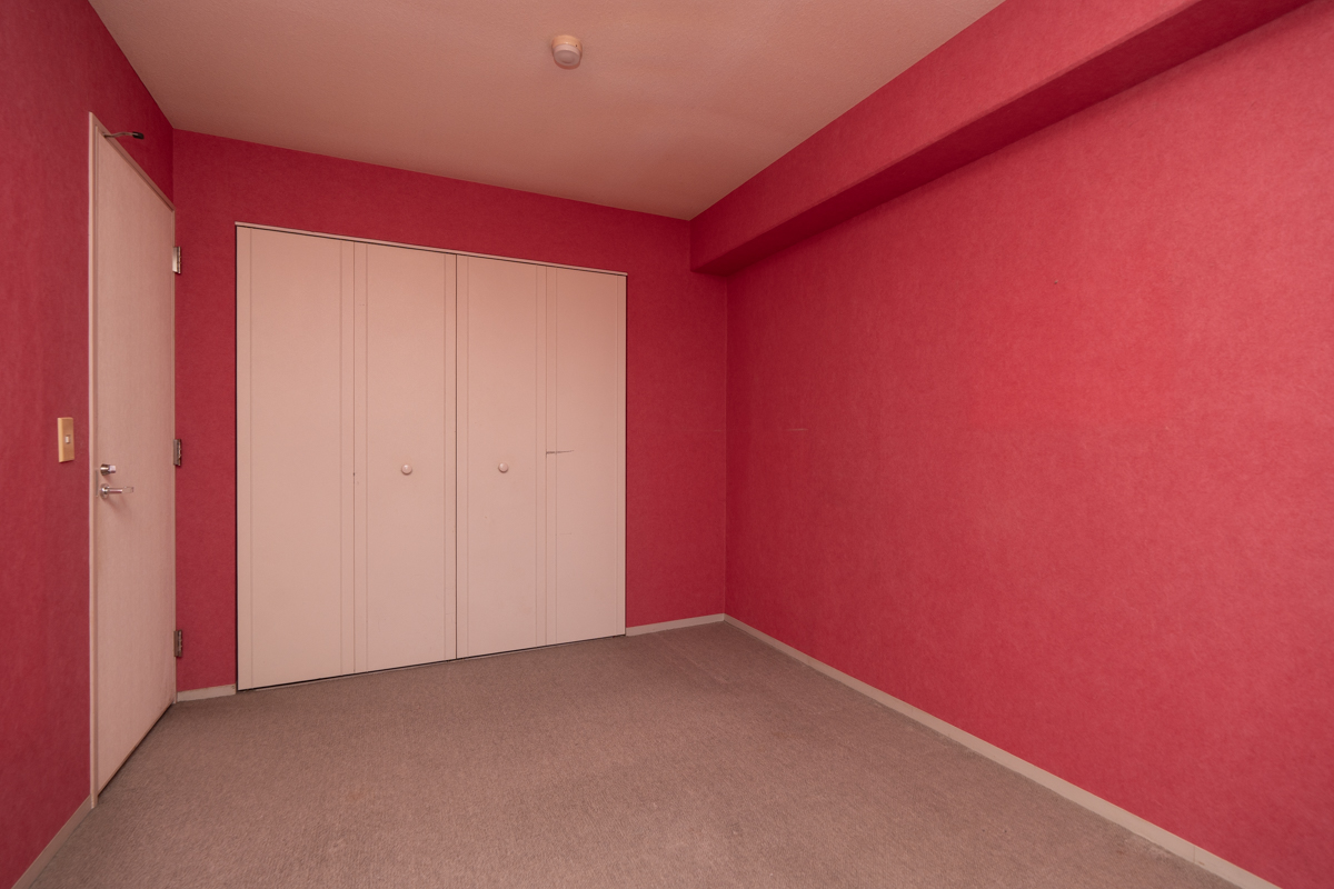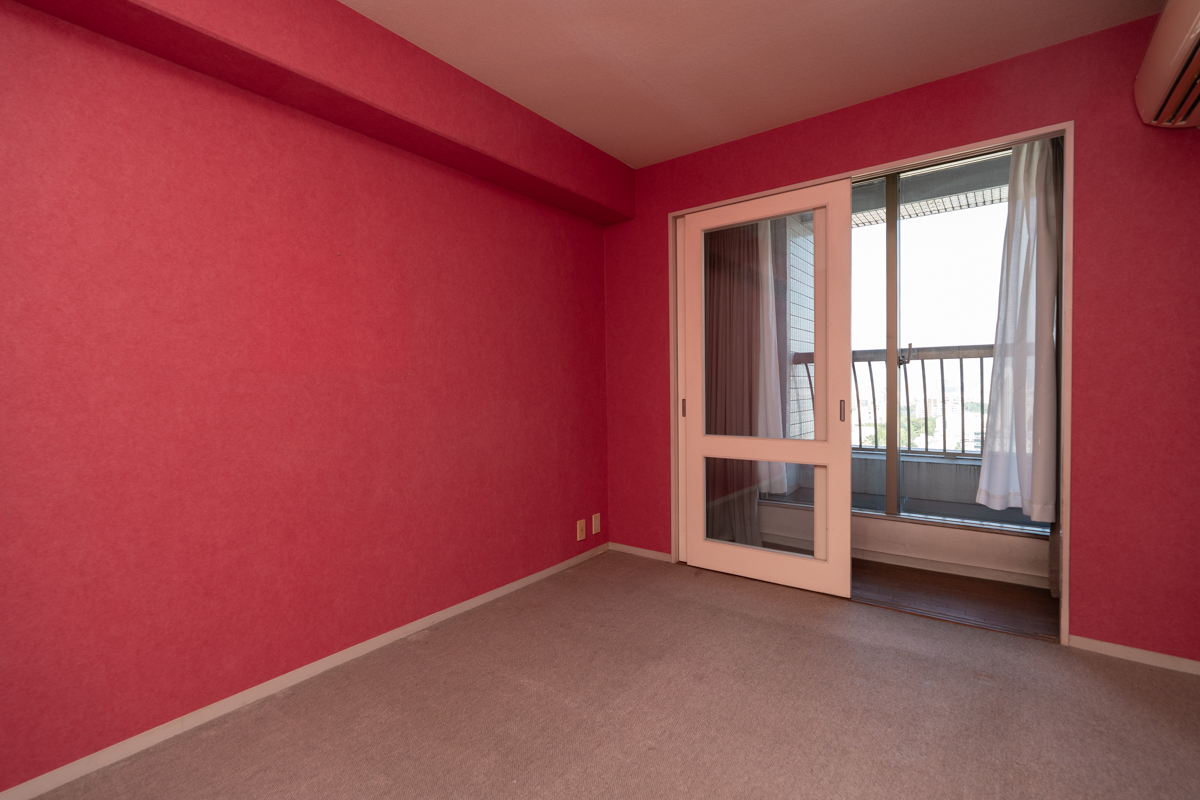 朝日がしっかり入る東向きの明るい部屋で奥にはサンルームもあります(赤い壁紙のお部屋)。もう一つの個室、青系の壁紙は視覚的に気持ちを落ち着けてくれる効果があるので、仕事部屋として使っていました。