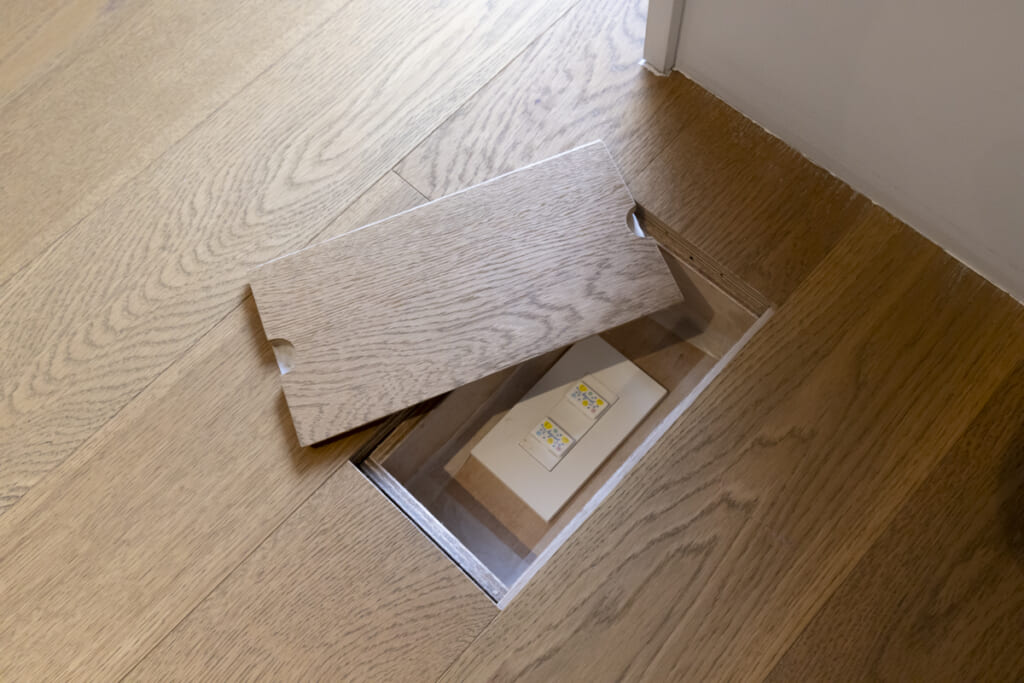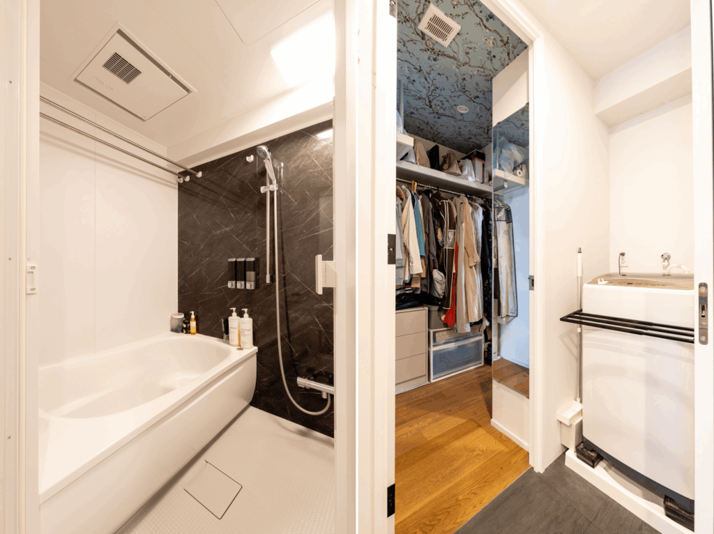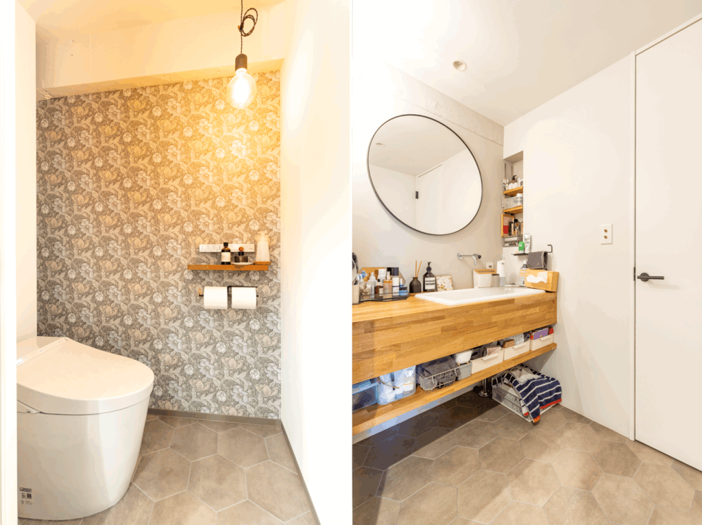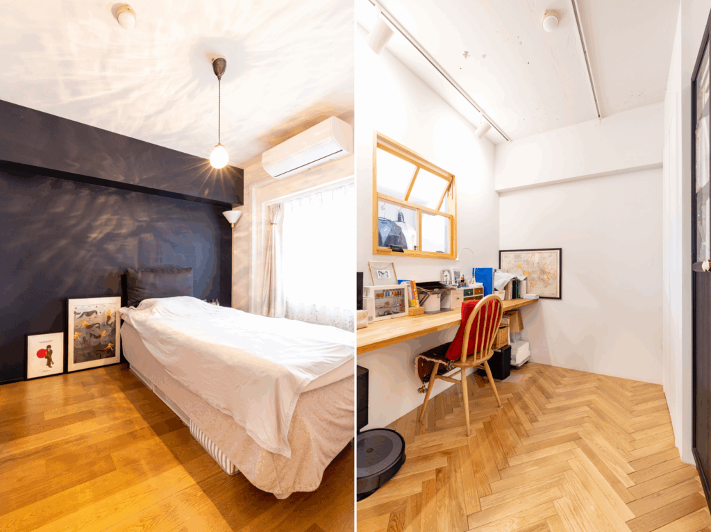最初は全フロアをヘリンボーンにしたいと思っていましたが、予算の兼ね合いでワークスペースのみにしました。今のフローリングも気に入っています。玄関と浴室以外は段差が無いので掃除しやすいのもポイントですね。部屋全体をお掃除ロボットに任せることができます。