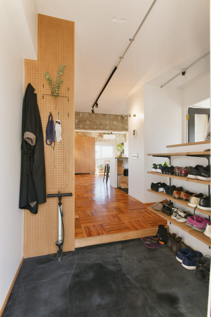 有孔ボードを活用し、玄関まわりを“隠さず整える”空間に。