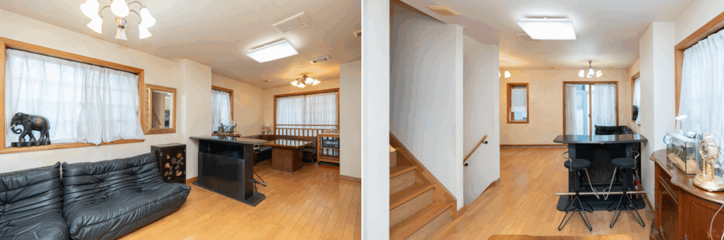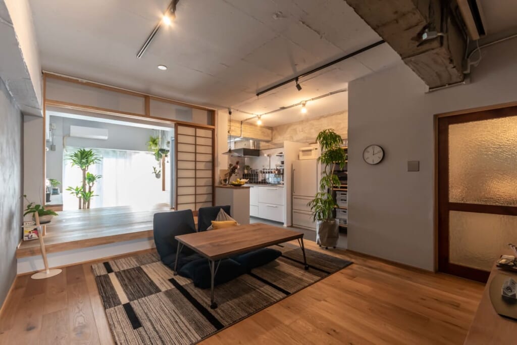 LDKの一角に設けられた小上がりは、リビングと緩やかにゾーニングしながら、空間に奥行きを与える工夫。段差によって場の役割を自然に分けつつ、畳や木材の床面が落ち着いた雰囲気を演出します。引き戸や障子を合わせれば、開閉で印象を変えられるフレキシブルな空間に。