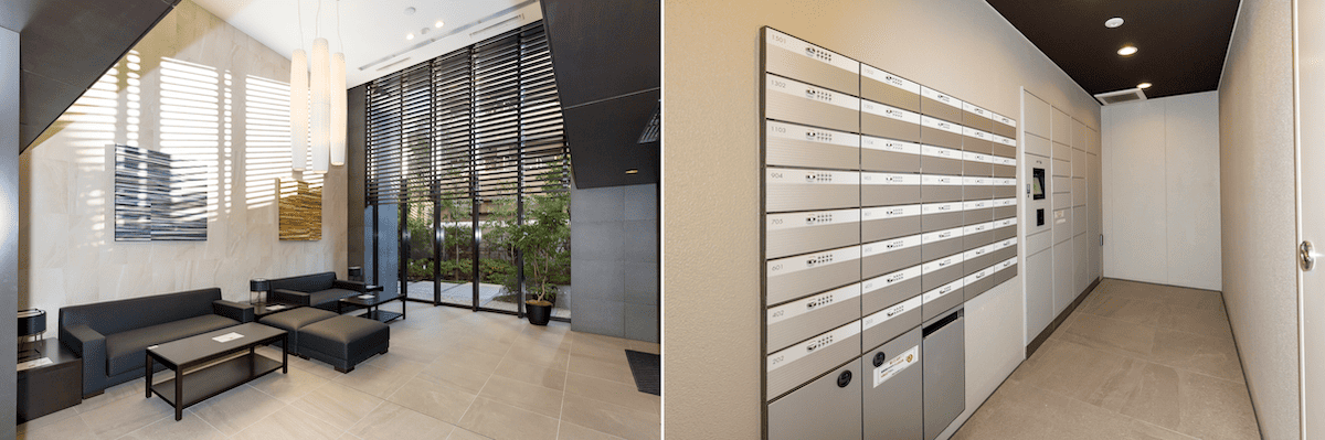 天井が高くきれいで広々としたロビー。宅配ボックスも備わっている