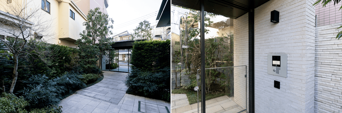 オートロック付き。緑豊かで落ち着いた雰囲気のエントランス