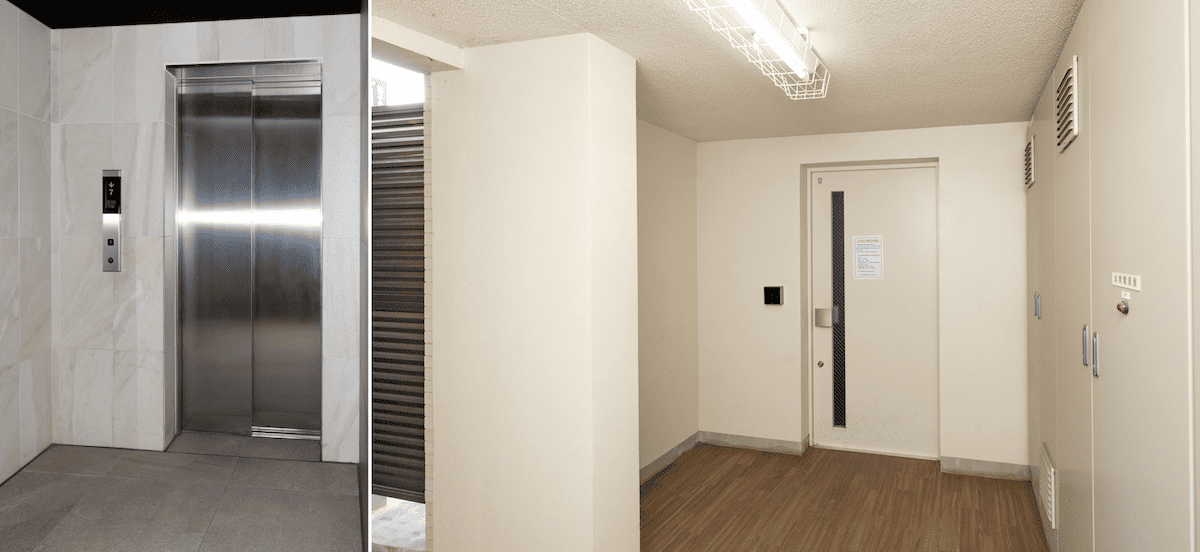エレベーターは1基。ゴミ置き場は屋内にあり24時間いつでも出すことができる
