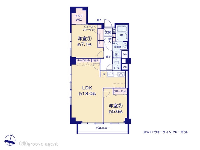 専有面積70.56㎡の2LDKは、夫婦世帯やコンパクトなファミリー世帯に適した広さです。南東向きで日当たりも良好、7階と上層階のため眺望も期待できます。フローリング・クロス・キッチン・ユニットバス等のリフォームが実施済みで、入居後すぐに快適な生活を始められます。WIC(ウォークインクローゼット)も備わり、角部屋のため採光・通風面でも有利です。エアコンも1台設置済みです。ただし、旧旧耐震のため地震への備えは十分に検討が必要です。