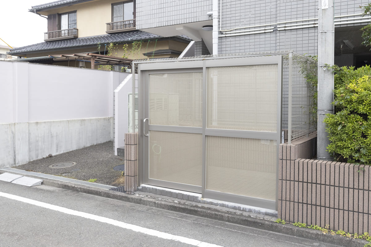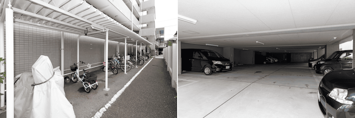 駐輪場は広く、バイクを置けるスペースもある。駐車場は敷地内の半屋内平置きなので、場所によっては雨風を凌げる