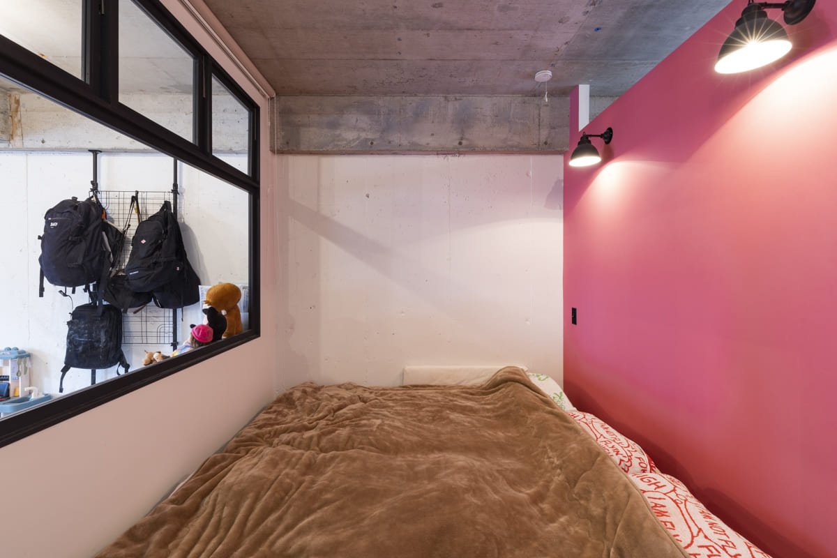寝室に使用しているスペース。内窓で閉塞感がなく、ブラインドをつければ視線のコントロールも可能。右側の壁の上には隙間があり通風も確保されている