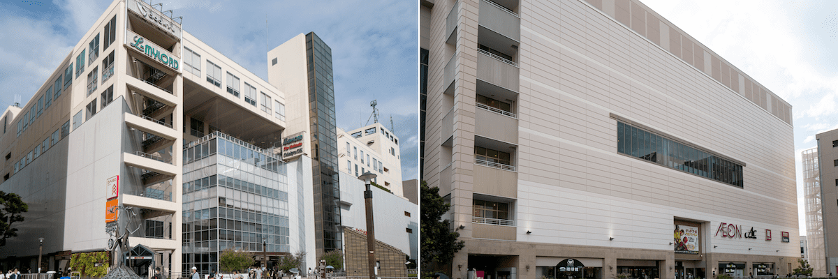 南口が拓けており、エルミロードやオーパ、イオンといった商業ビルが徒歩3分圏内に立ち並ぶ。映画館はイオンの中に
