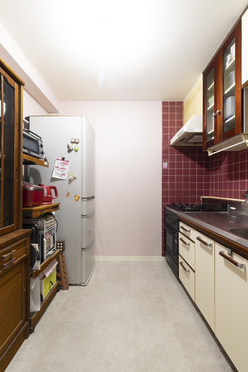 リビングに隣接されているキッチン。床と壁紙は変えられているが、タイルは入居時のまま