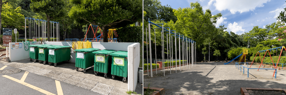 ゴミ置き場は建物のすぐ目の前で出しやすい。コンパクトな公園もあるので、小さな子どもをちょっと遊ばせる場所として重宝する