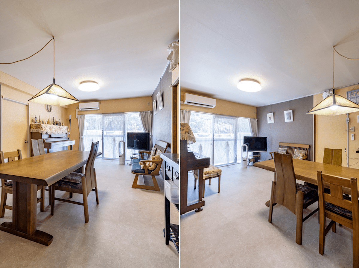 テーブル、ソファー、アップライトタイプのピアノを置いても余裕のある広さ。床は大理石調にし、壁紙は一部色と質感の違うものがあしらわれている