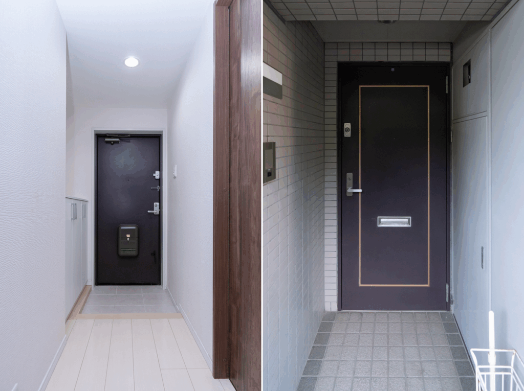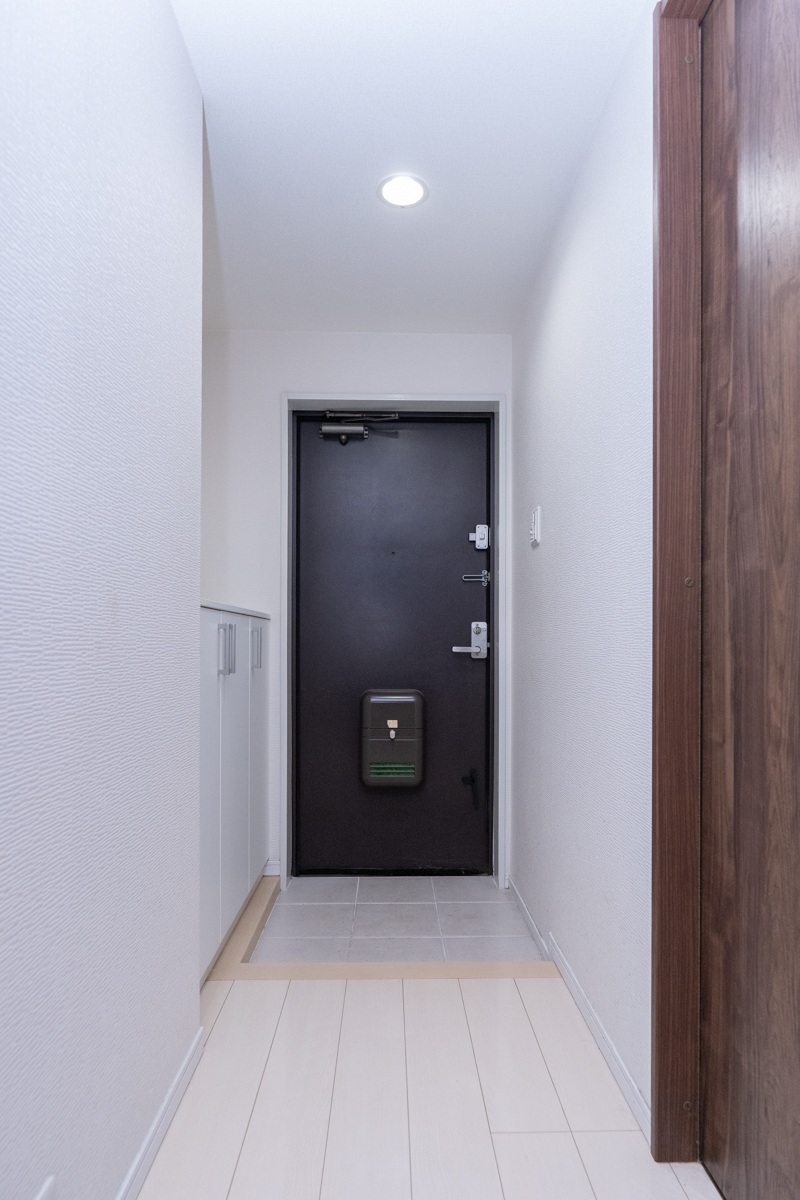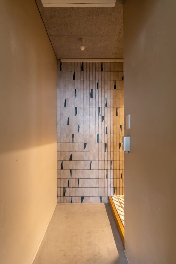 玄関正面のタイル壁が、住まいの第一印象をつくるアクセントに。光の入り方で表情が変わり、シンプルな空間にほどよいリズムと世界観を添えてくれます