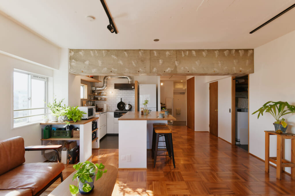 木の風合いが際立つフローリングは、空間全体にあたたかみをもたらす存在。スタイリッシュなキッチンとの対比が、空間に立体感と奥行きを与えています。ナチュラルながらも一癖ある床面が、暮らしの舞台としての魅力を高めています。