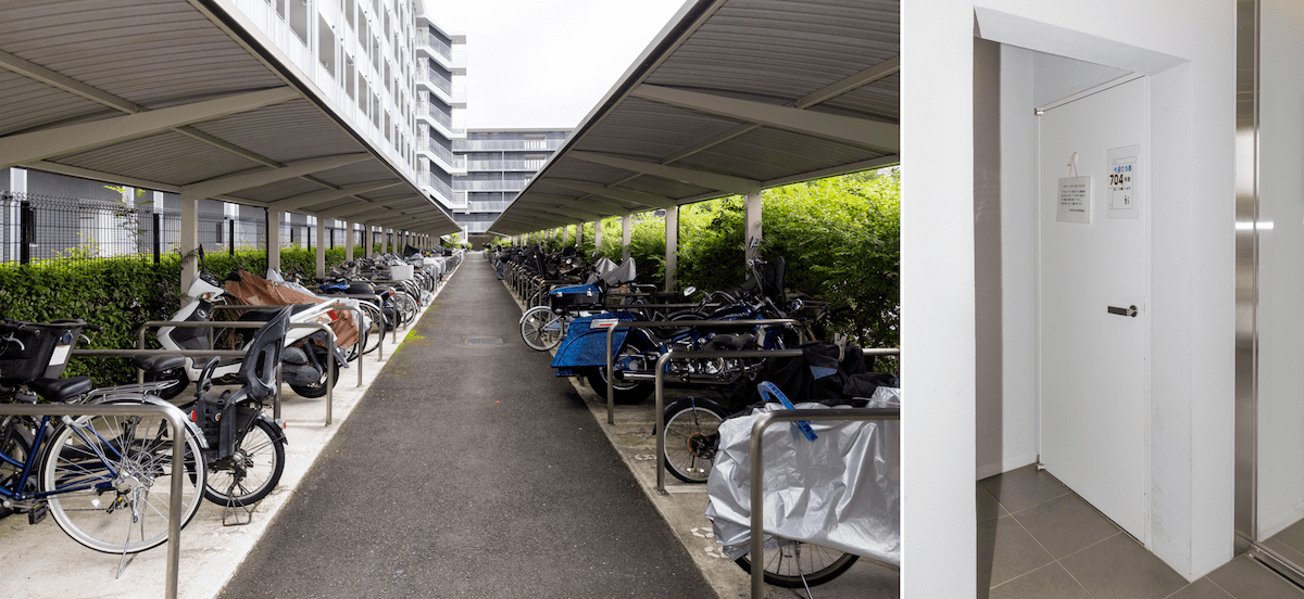 自転車置場、バイク置き場のスペースも広い。ゴミ捨て場へは屋内からアクセスできる