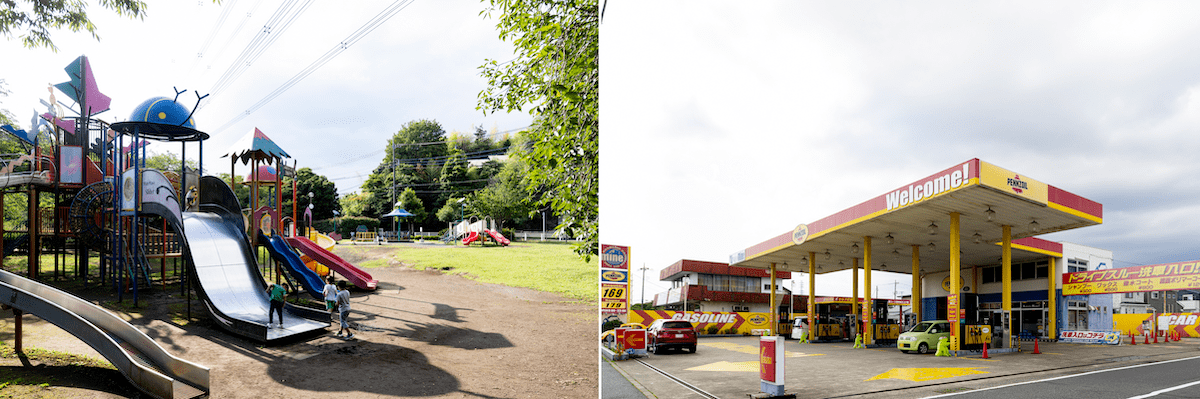 子供心をくすぐる大型遊具のある綾南公園。敷地内に川が流れ自然豊かな雰囲気も魅力。ミネガソリンショッパーズは有名ミュージシャンのミュージックビデオに登場する、実際に運営されているガソリンスタンド