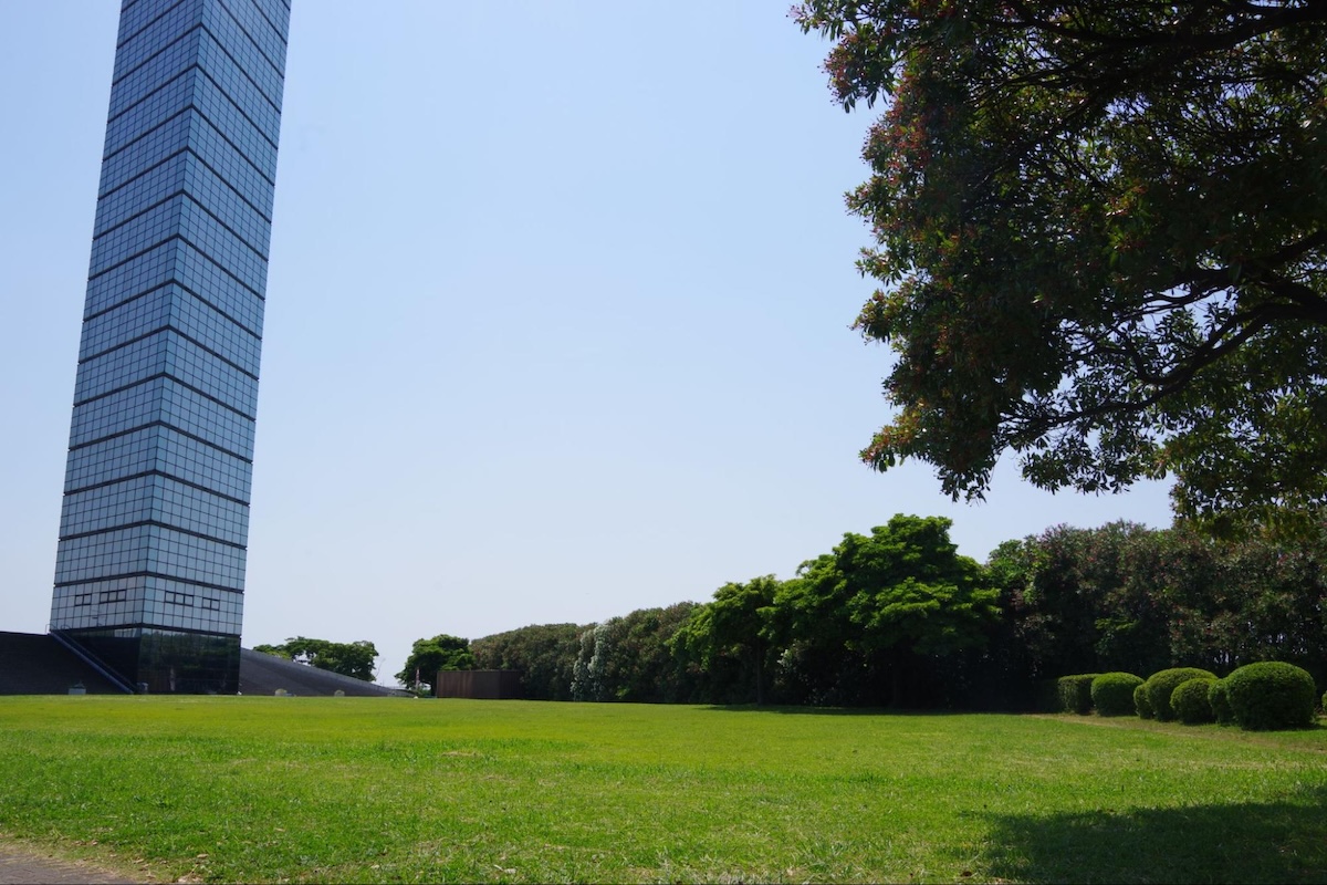 マンションから徒歩3分の場所にあるポートタワー。周辺のポートパークは一面の緑