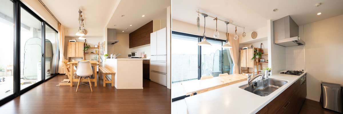 キッチンに立っている時でも、リビングで遊んでいる子どもの様子を見ながら料理できるので、便利です。よくお友達を呼んでホームパーティーをするのですが、自然と会話が弾んで、笑顔が生まれる空間だと感じています。