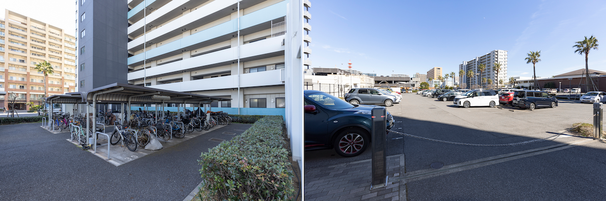 駐輪場スペースも十分。駐車場は100%利用可能