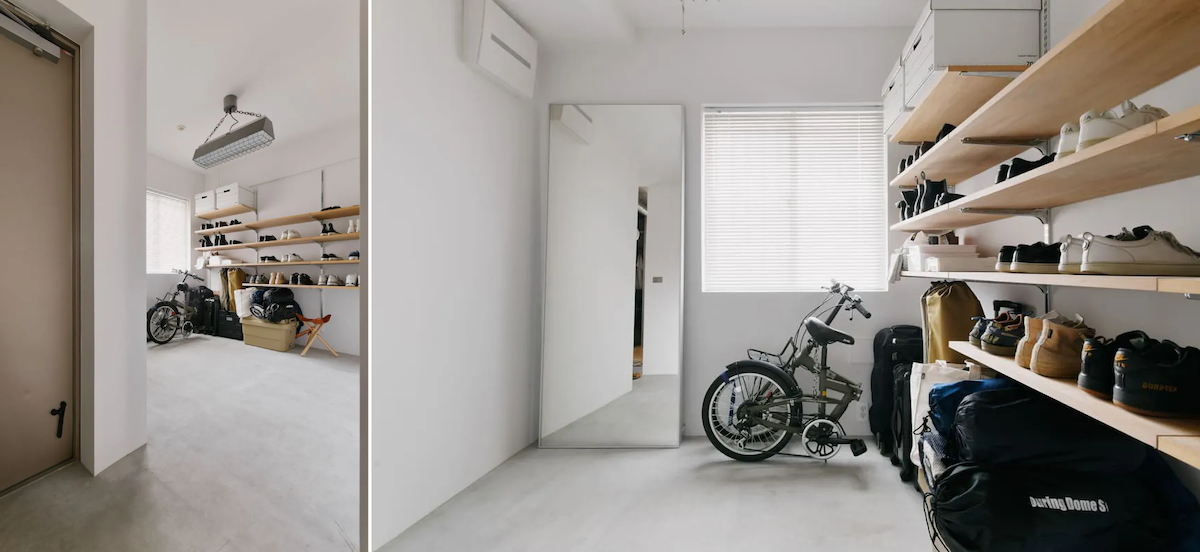思い切って玄関土間を広くとるのもおすすめ。通気性のよいオープンラックを造作すれば、アウトドア用品も汚れやカビを気にせずに収納できますよ。