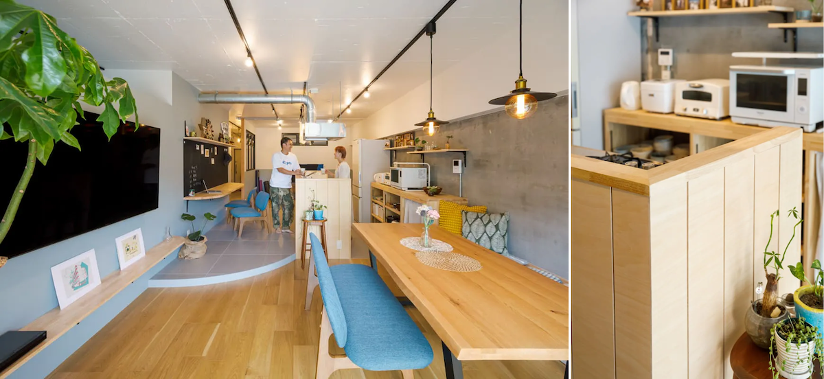 海がお好きなら、爽やかな西海岸テイストもおすすめです。一般的なシステムキッチンも、造作腰壁でお部屋の内装に合わせたおしゃれなデザインに。