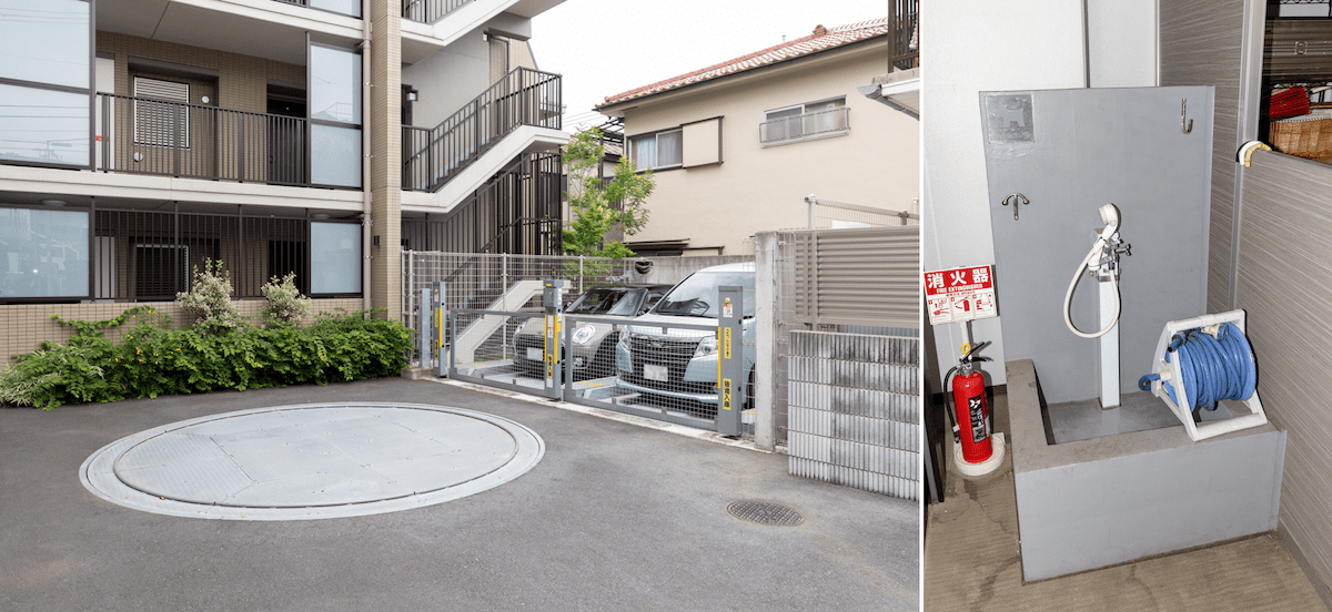 機械式の駐車場付き。バイク置き場もある。ペット飼育OKで、ペット用の足洗い場も設置されている
