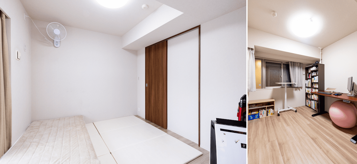 LDKに隣接する個室の引き戸は収納することでLDKを拡張可能。WICが備わっていて収納力もある。玄関側の個室にも窓があるのでジメジメするようなことはない